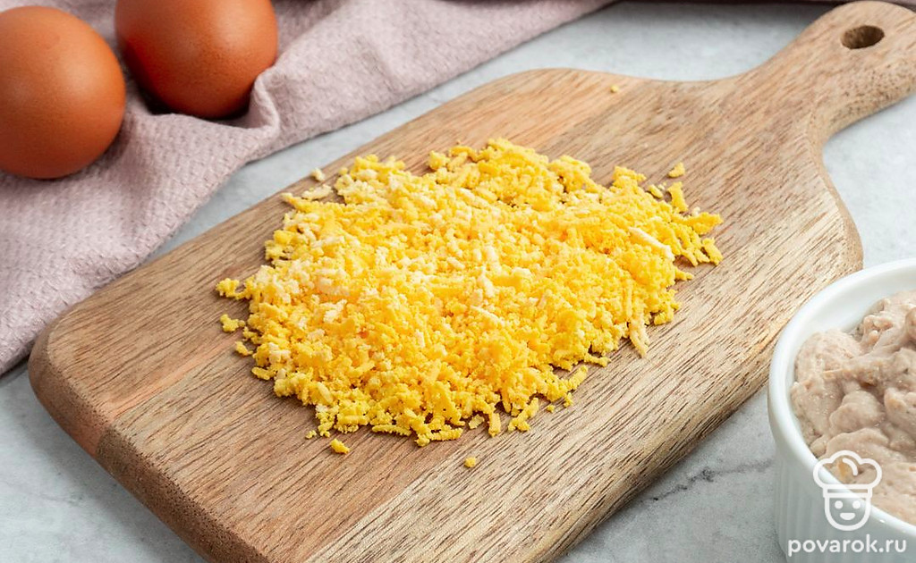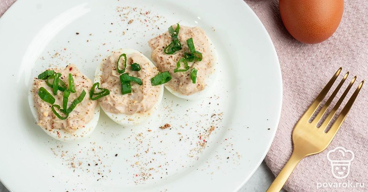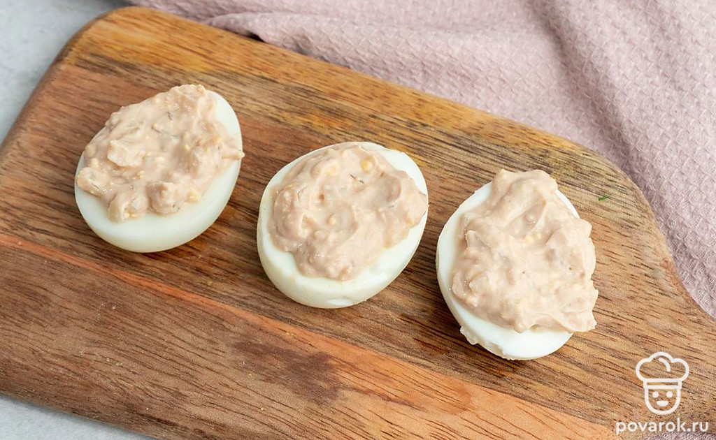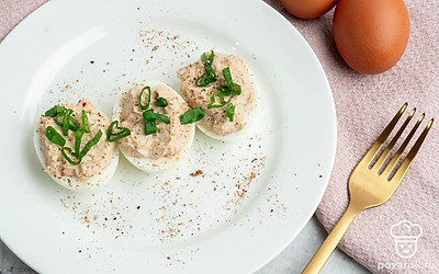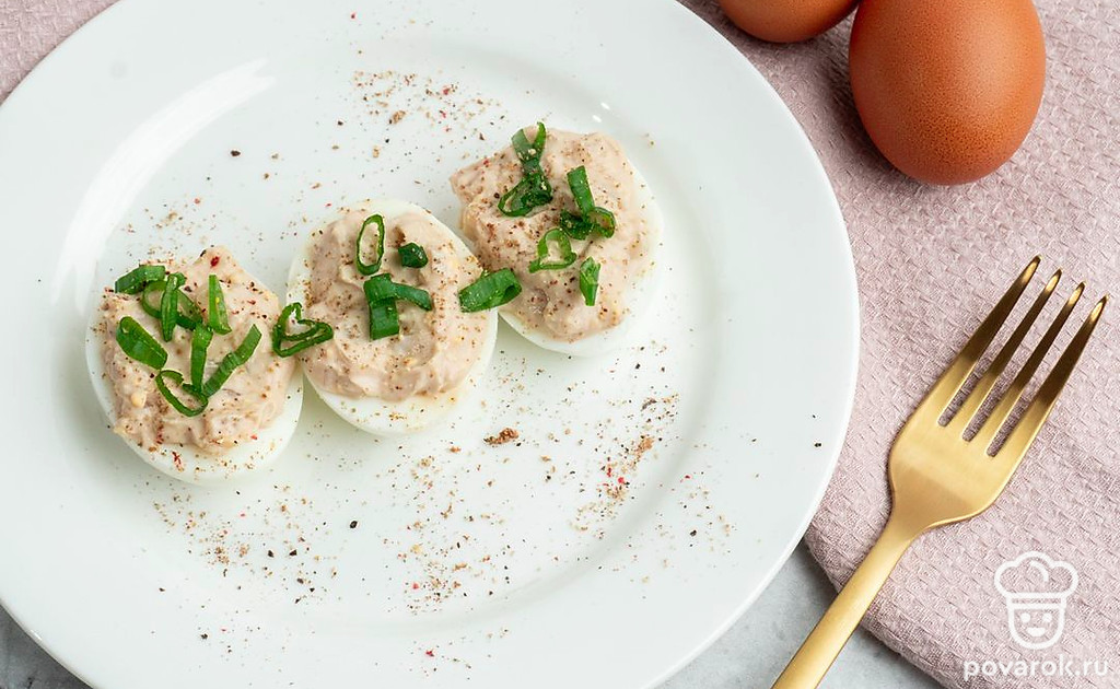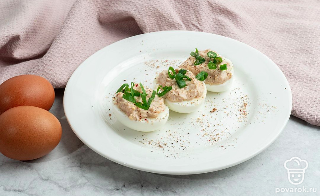 Фаршированные яйца как закуска появились в Европе в конце XV века. Только разница между современным рецептом и старым европейском состоит в майонезе, которого тогда не было и в помине. Впервые майонез стал упоминаться как ингредиент этого рецепта в «Поваренной книге Бостонской кулинарной школы» 1896 года. С ним эта закуска явно стала намного вкуснее. Наша ее версия с начинкой из печенью трески и луком также не обходится без прекрасного майонеза.
