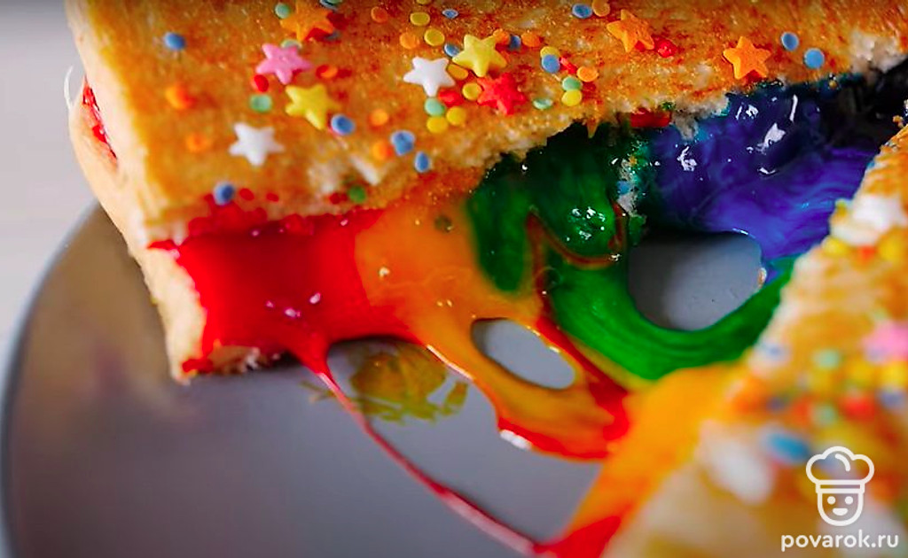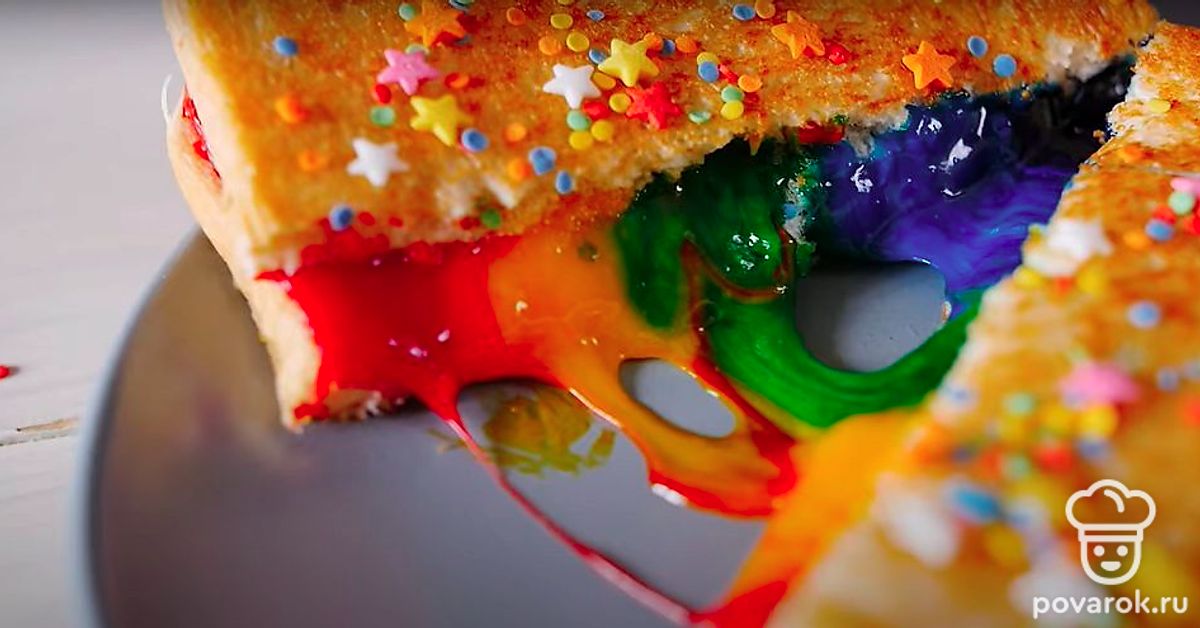 Выложите слоями окрашенный сыр на тост, согласно порядку цветов радуги, накройте его хлебом и обжарьте на сливочном масле с двух сторон до румяной корочки.