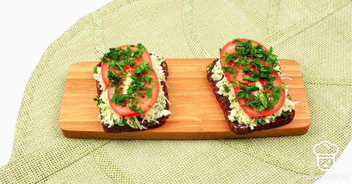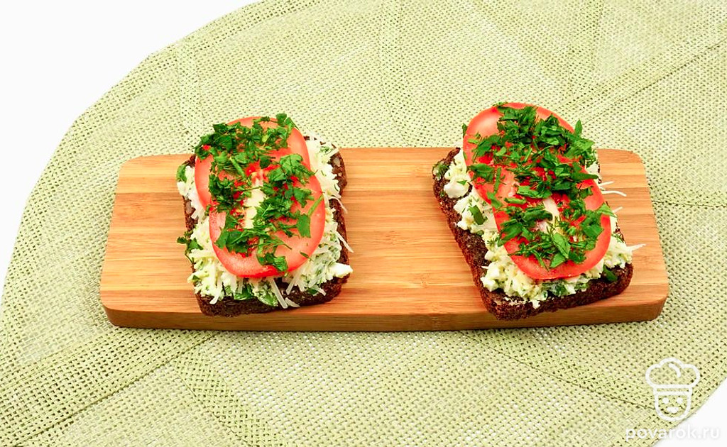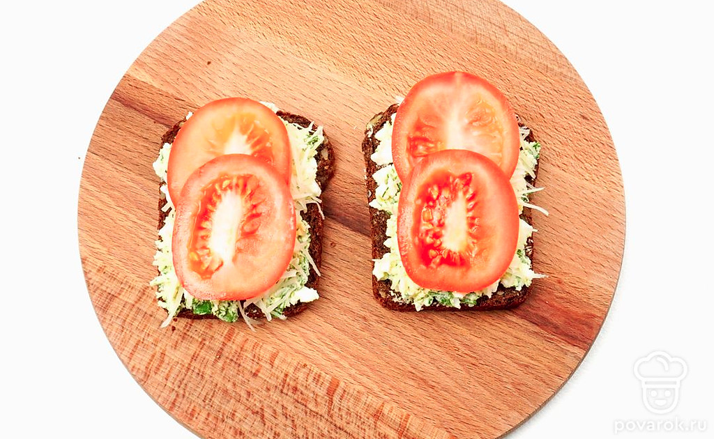 Получившуюся массу выложите на бутерброды. Сверху разместите ломтики помидоров.