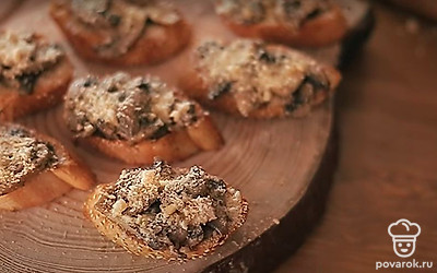 Готовую начинку выложите на подсушенный хлеб и присыпьте тертым пармезаном.