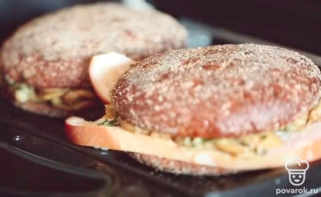 Выложите начинку на хлеб слоями: хлеб, курица, грибы, хлеб. Затем запеките сендвичи в сендвичнице в течение пары минут.