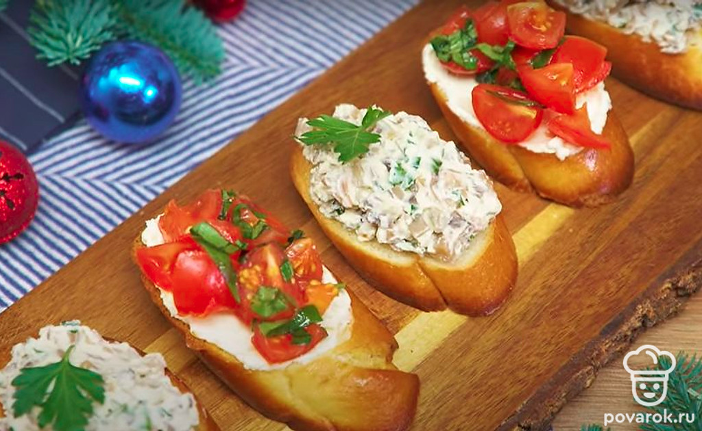 Оригинальный рецепт быстрой закуски для праздничного стола. Приготовьте брускетты в двух вариантах: с обжаренными грибами и творожным сыром и с томатами и чесноком.