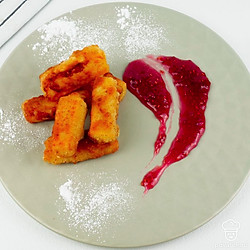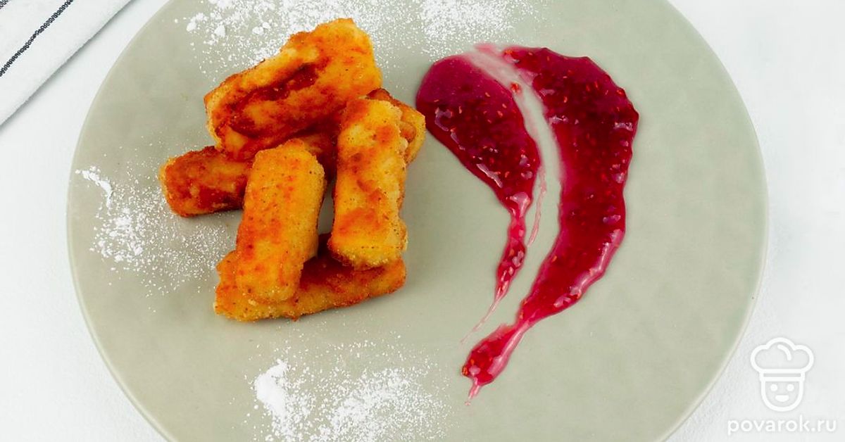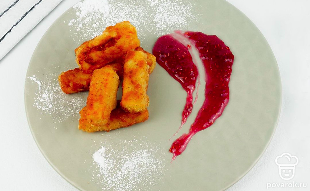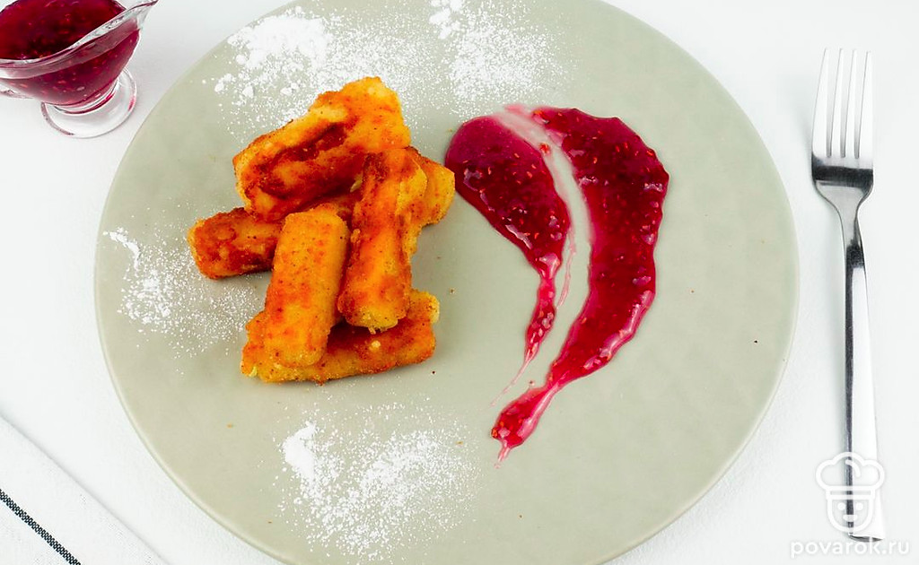 Жареный в панировке сыр — отличная закуска для вечера в кругу друзей! Если любите сочетание соленого со сладким, к сыру можно добавить кисло-сладкий соус из брусники, клюквы или малины. А как соленую закуску сыр можно подать с чесночным или томатным соусом к холодному пиву.