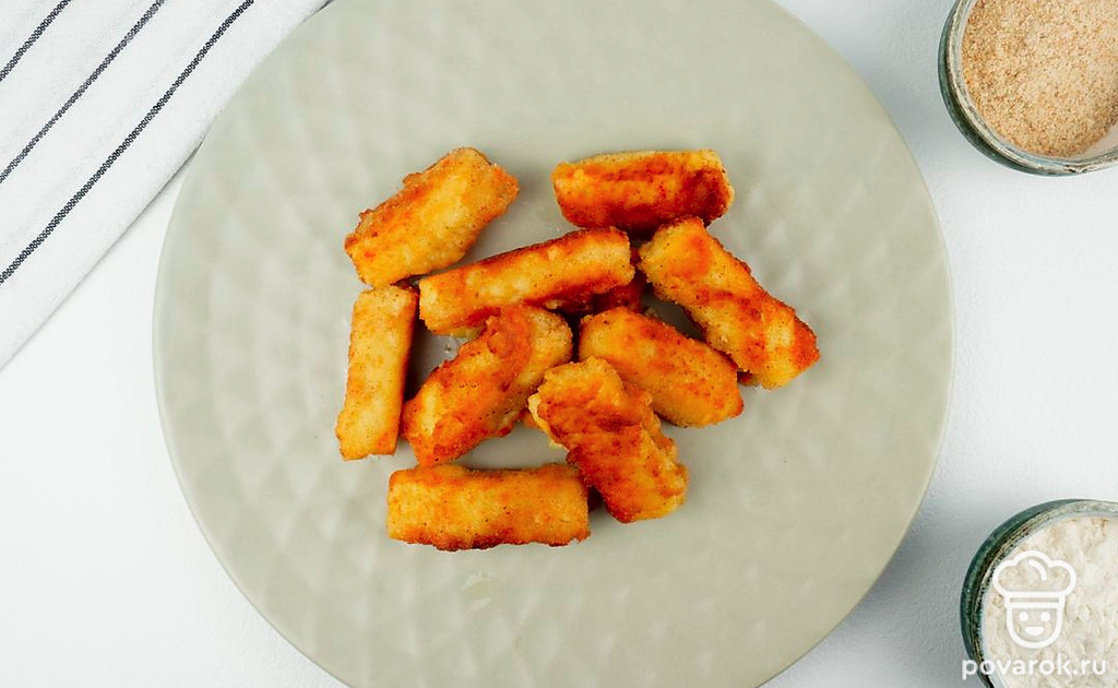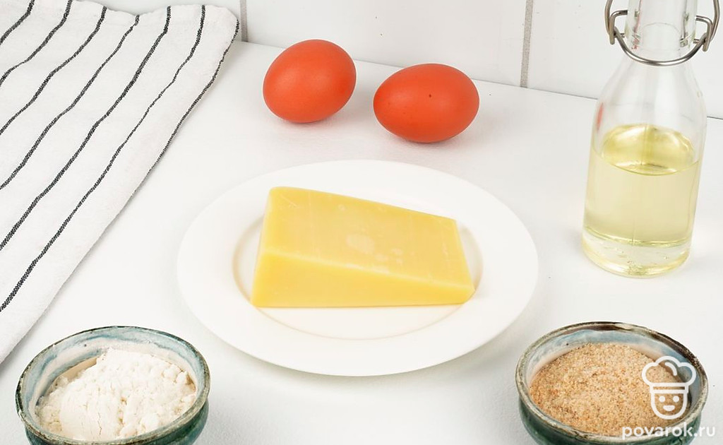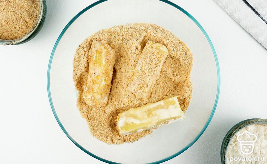 Чтобы сыр получился еще более хрустящим, стоит повторить процедуру панировки от яйца до сухарей.