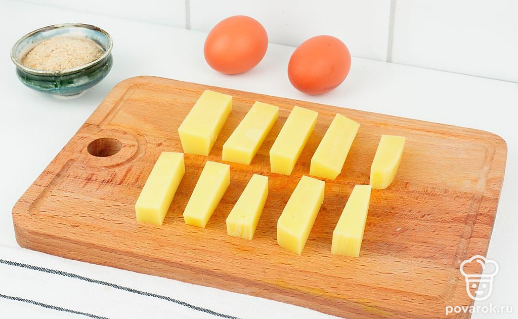 В миску разбейте яйца и взбейте венчиком или вилкой до однородной консистенции. Каждый кусочек сыра хорошенько обмакните в яйце.