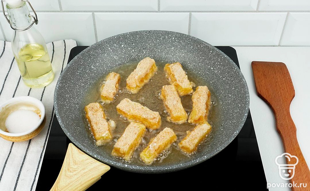 В глубокой сковороде разогрейте масло, выложите сырные брусочки и обжаривайте на огне чуть выше среднего до образования золотистой корочки.