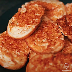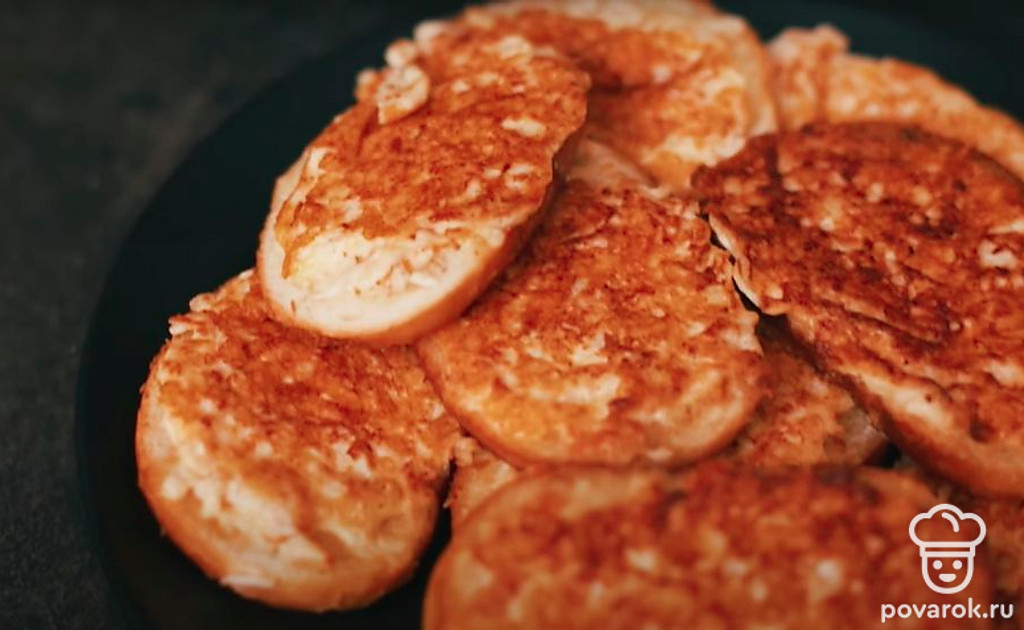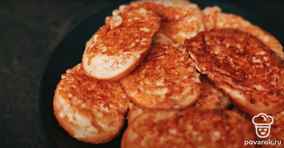 Распределите начинку на кусочке хлеба с одной стороны. Затем разогрейте сковороду с растительным или сливочным маслом и обжарьте гренки с двух сторон по 2-3 минуты до золотистости.