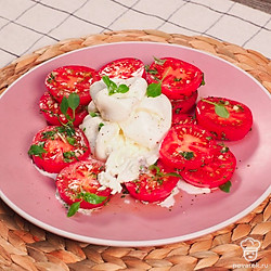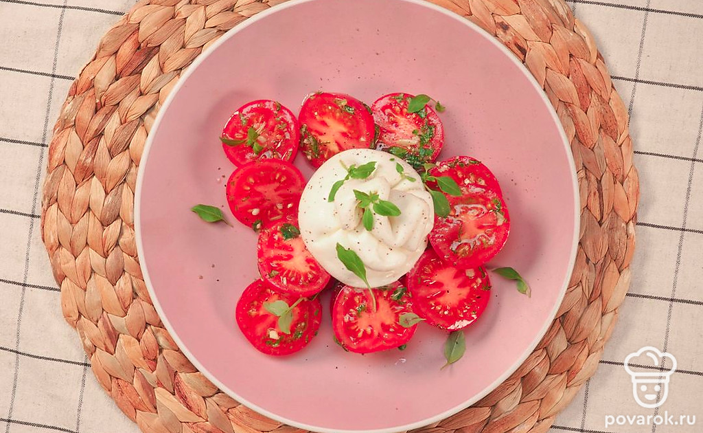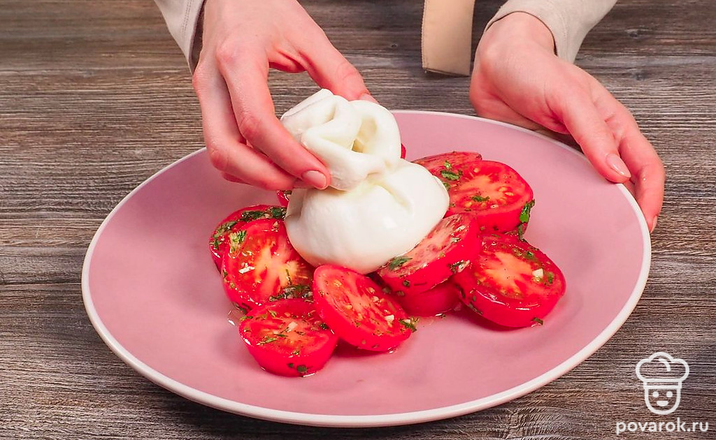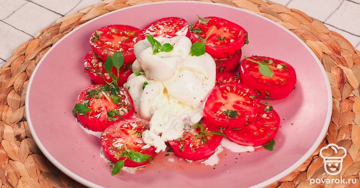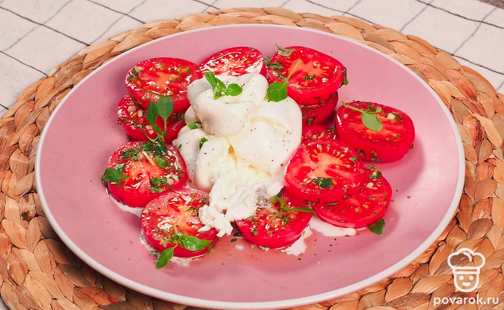 Буррата — итальянский деликатес, который представляет собой мешочек из моцареллы с нежнейшей сливочной начинкой внутри. Так же, как и моцареллу, в Италии традиционно подают буррату с помидорами, базиликом, другими овощами и зеленью. Такой салат получается сбалансированным по вкусу и полезным по микроэлементам. Лучше сочетать этот сыр со свежими спелыми томатами, только что сорванными с грядки.