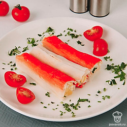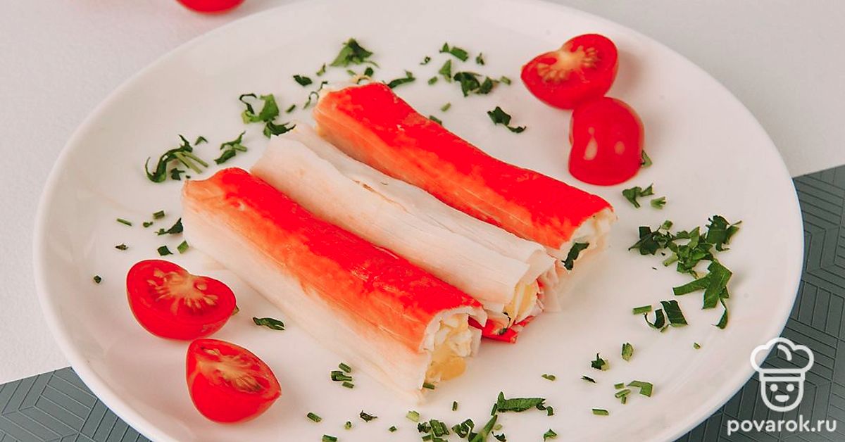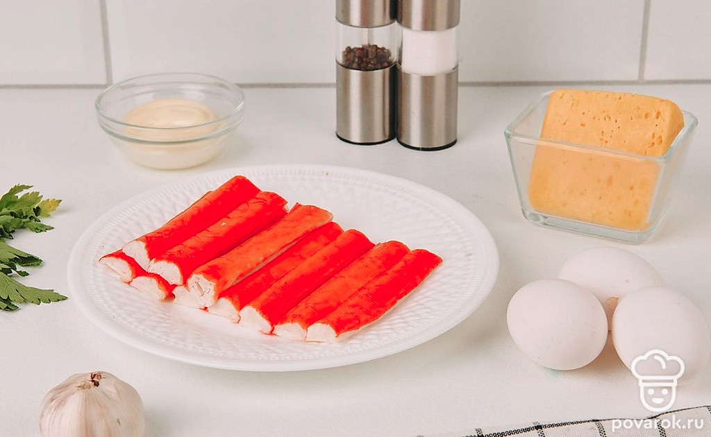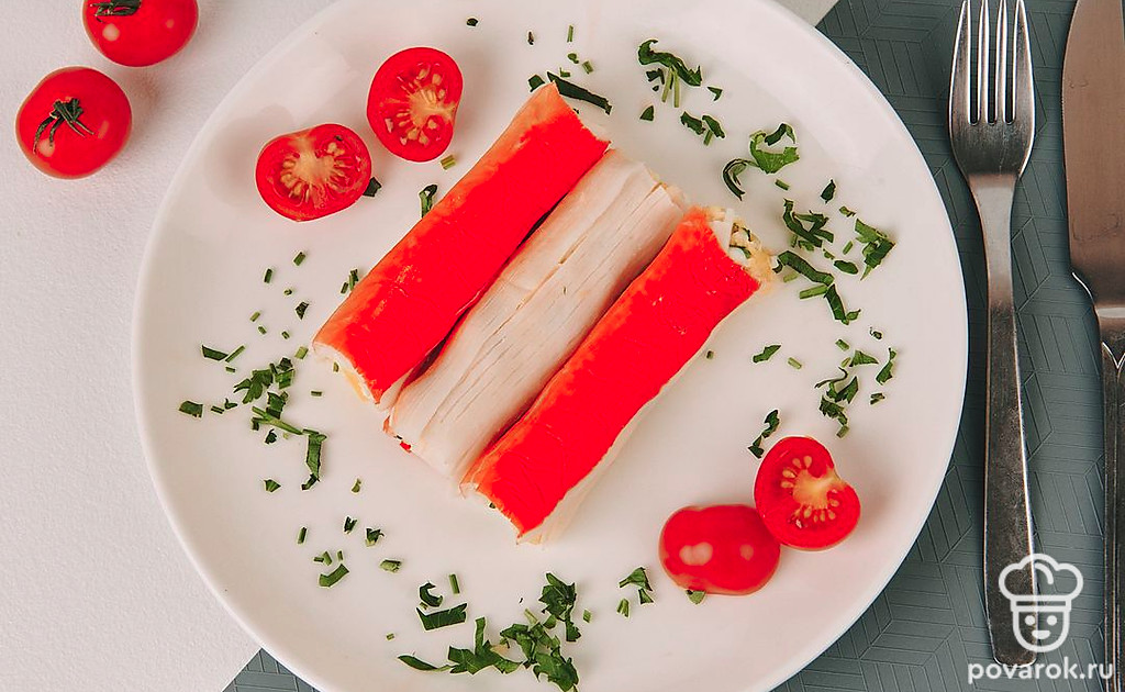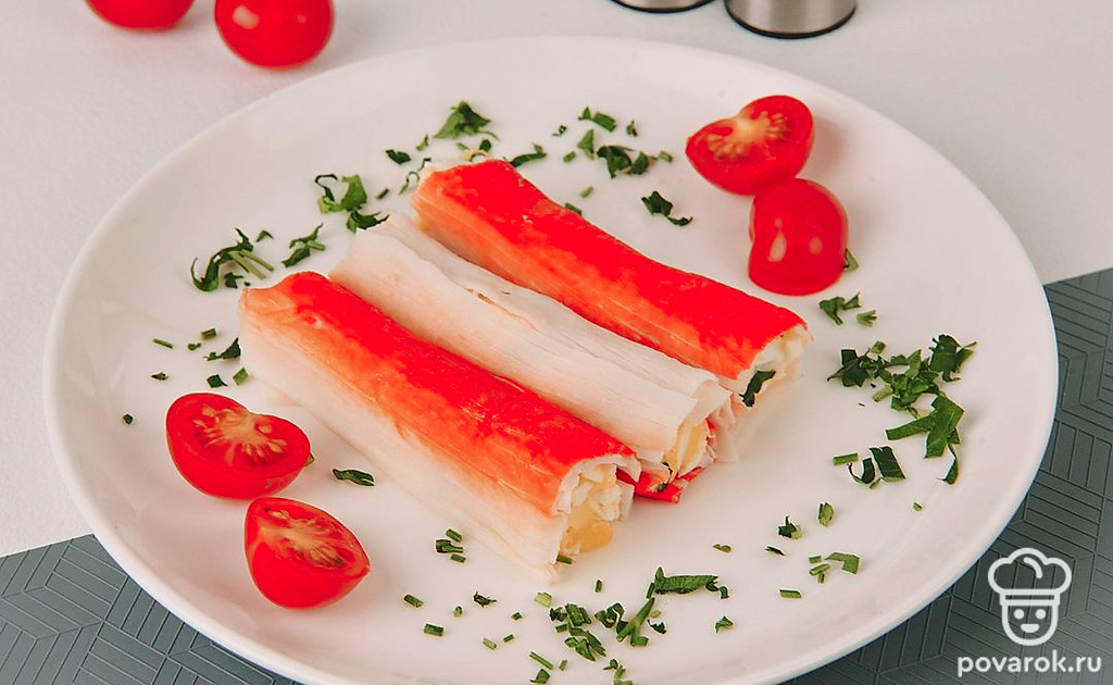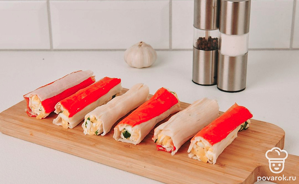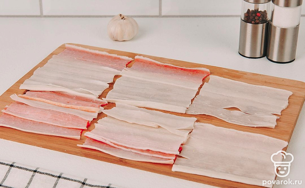 Крабовые палочки должны быть хорошо разморожены, чтобы не ломаться, а мягко разворачиваться.