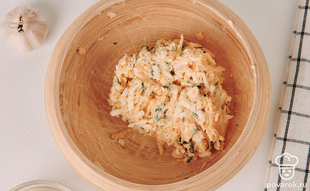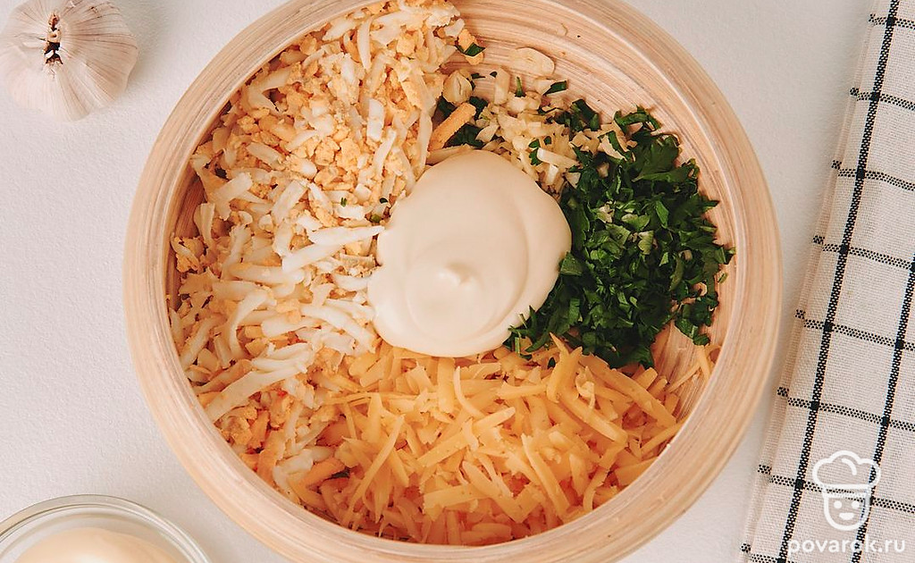 Мелко нарежьте чеснок и зелень, натрите на крупной терке сыр и яйцо. Переложите все ингредиенты в глубокую тарелку и добавьте к ним майонез.