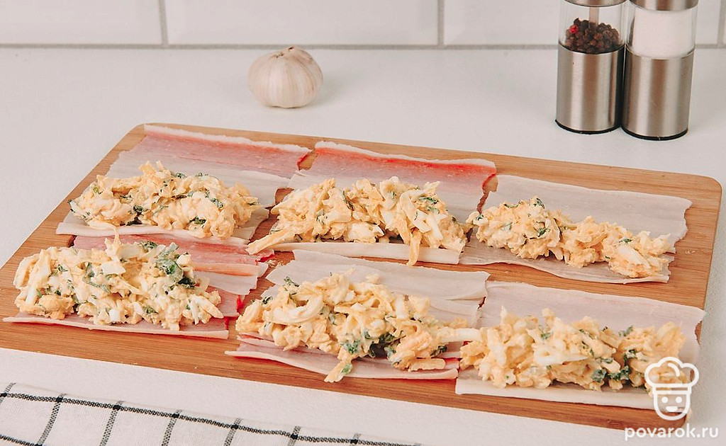 В каждую развернутую крабовую палочку положите несколько чайных ложек начинки.