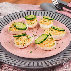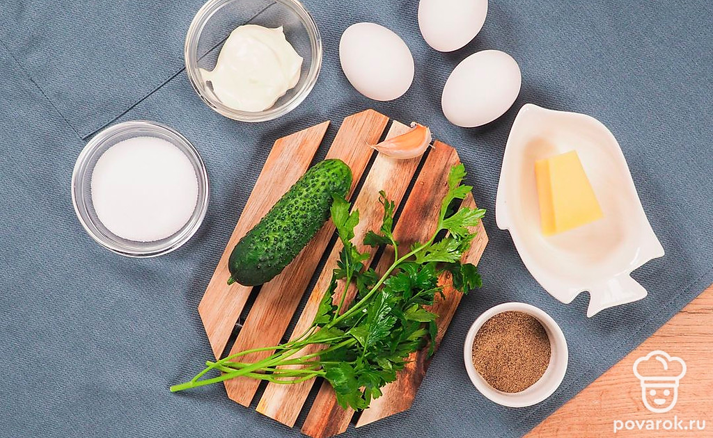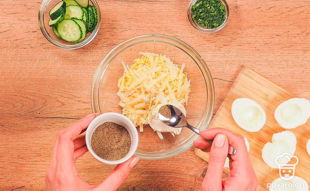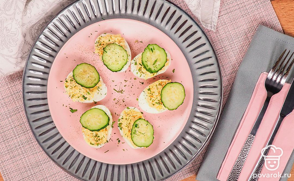 Существует много рецептов фаршированных яиц: в духовке с сыром, с крабовыми палочками, с печенью трески, с красной икрой. Один из простых способов приготовления требует наличия в холодильнике всего несколько основных ингредиентов — сыра, чеснока, яиц. Если имеется еще и свежий огурец, то он подойдет в качестве украшения блюда. Желательно использовать свежий твердый сыр с плотной поверхностью, молочным ароматом и ровной структурой.
