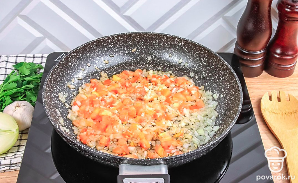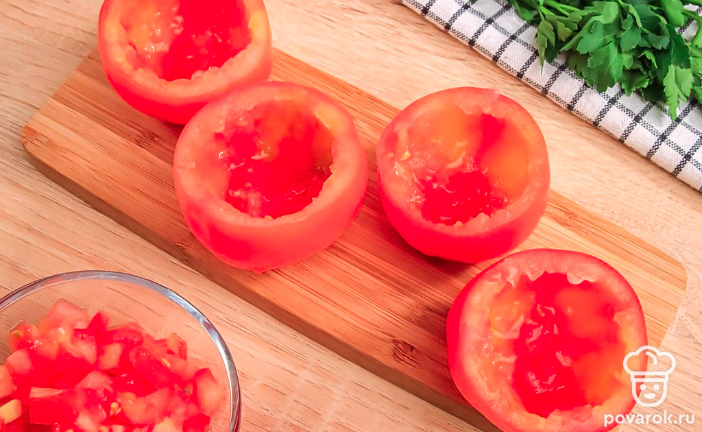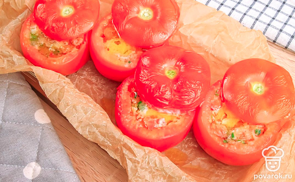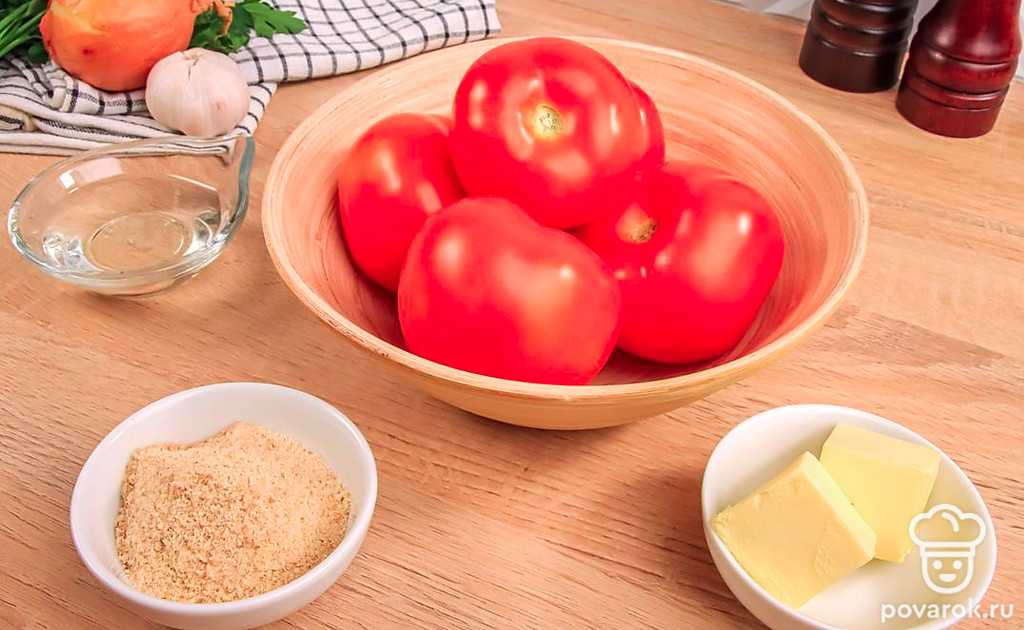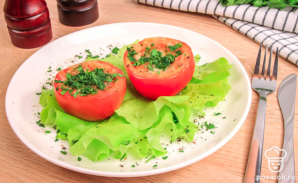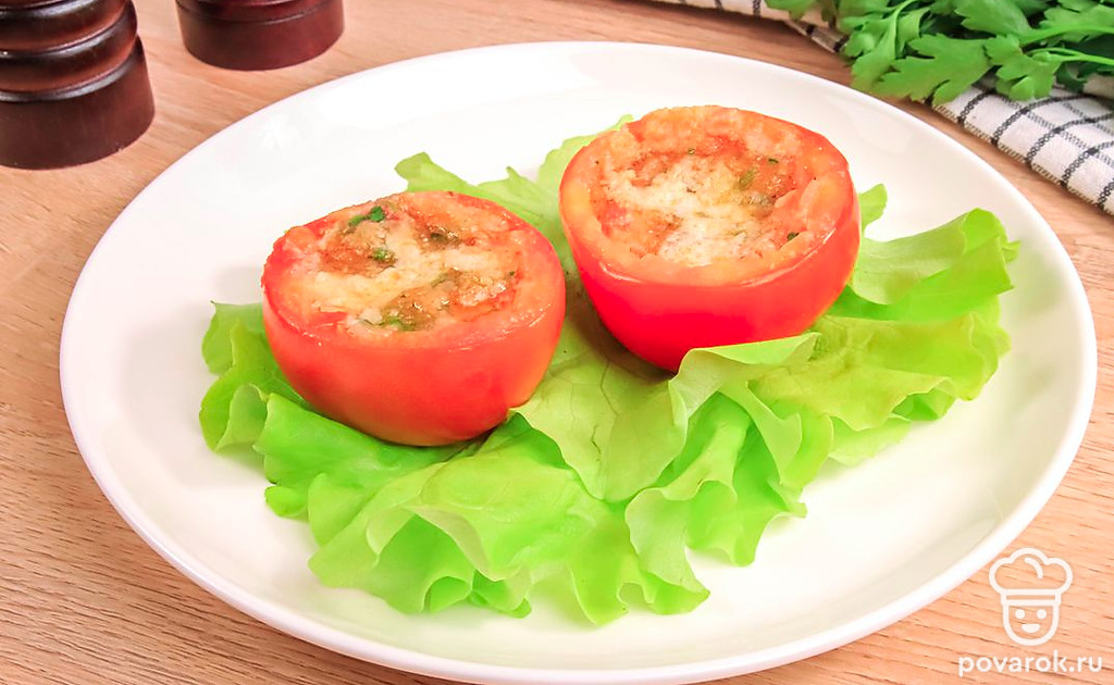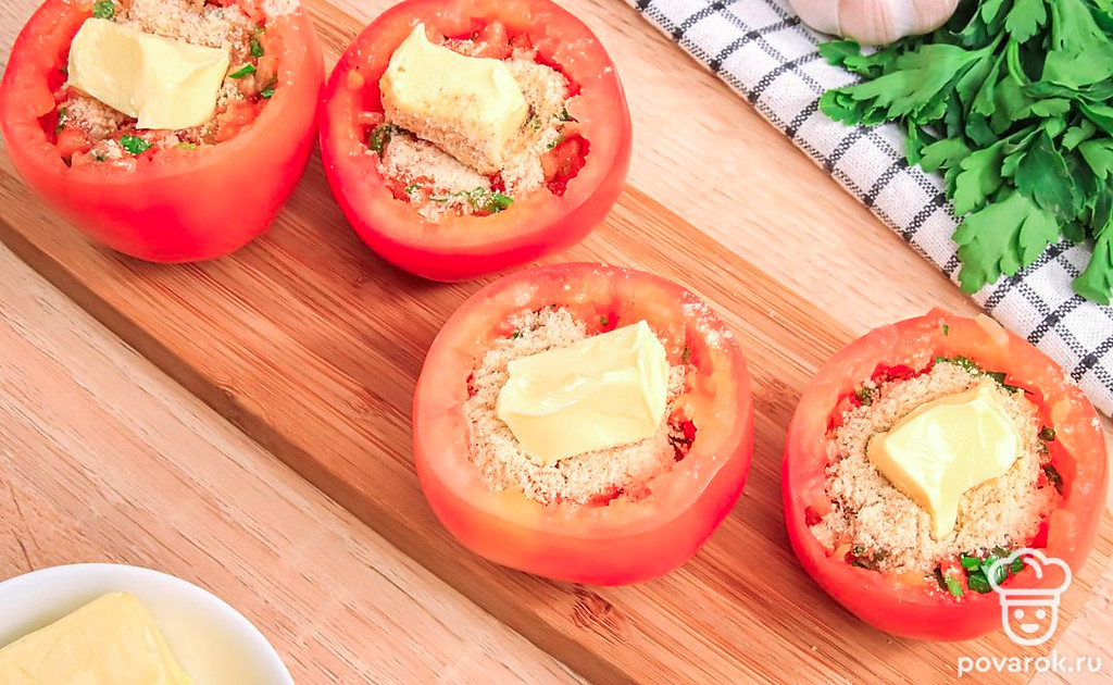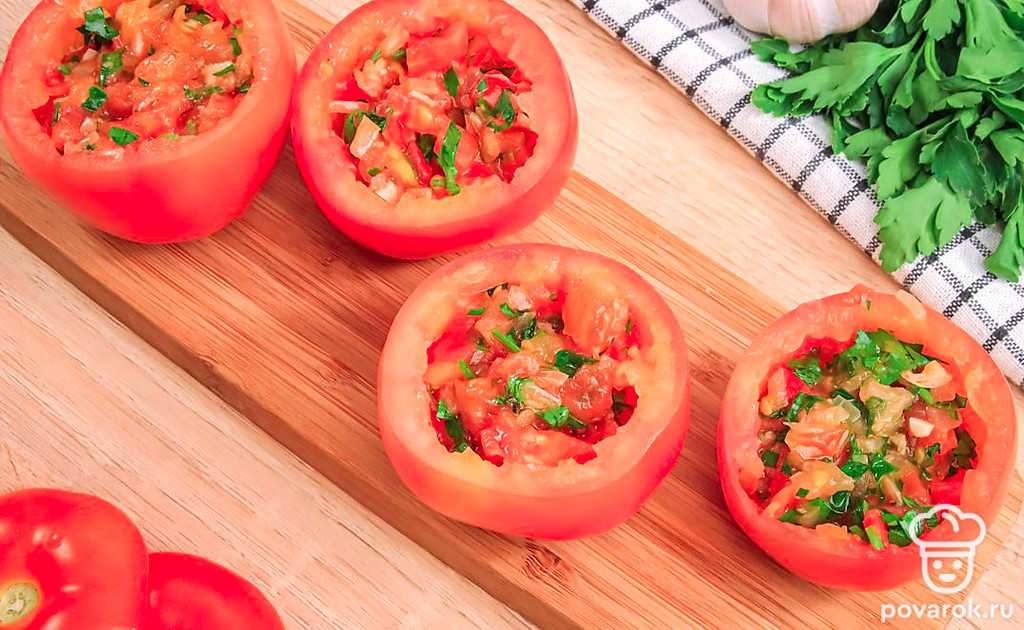 Помидоры, фаршированные луком и чесноком — интересная и легкая закуска, которая отлично подойдет для праздничного стола или фуршета. Начинка для таких помидоров готовится из лука, чеснока, зелени и помидорной мякоти. Сверху помидоры покрыты хрустящей корочкой из панировочных сухарей. Закуска очень проста в приготовлении и потребует всего 25 минут вашего времени. Добавьте в нее сыр и грибы, тогда она станет еще вкуснее.
