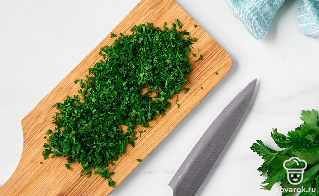 Отделите листья петрушки от стеблей, мелко нарежьте зелень.