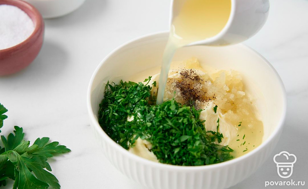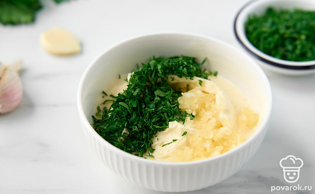 Выложите сливочное масло в миску. Соедините масло с измельченным чесноком и рубленой петрушкой.