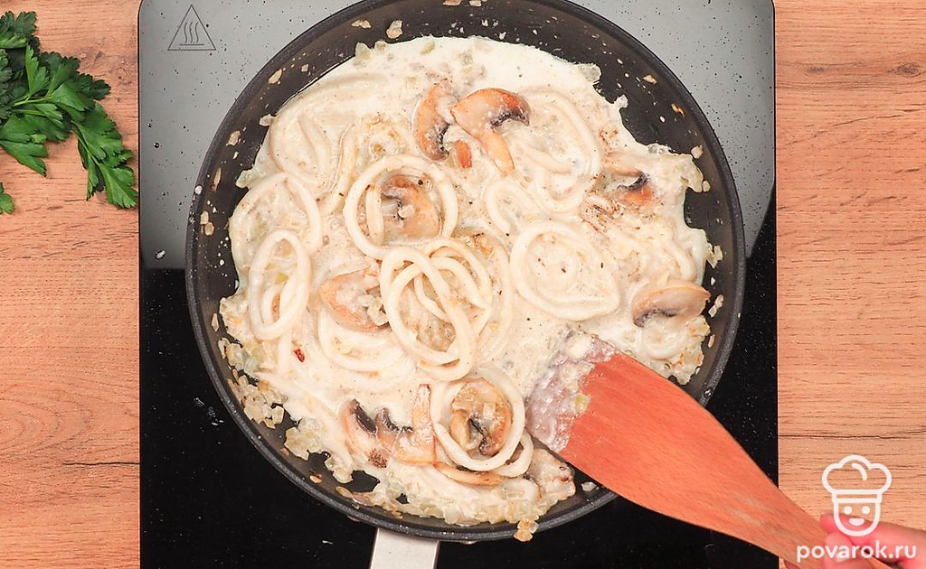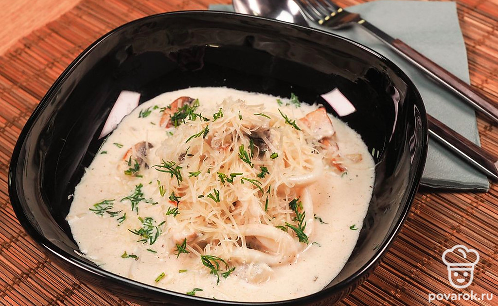 Кальмары в сливочном соусе с чесноком — не только вкусное, но и полезное блюдо, так как морской продукт содержит в себе большое количество белка. Приготовление блюда по этому рецепту не займет много времени. Однако,чтобы блюдо получилось вкусным, особое внимание следует уделить выбору кальмара. Обязательно обращайте внимание на цвет мяса под кожицей: оно должно быть светлого кремового цвета. Чтобы блюдо было сытнее, подавайте кальмаров с рисом или свежими овощами.