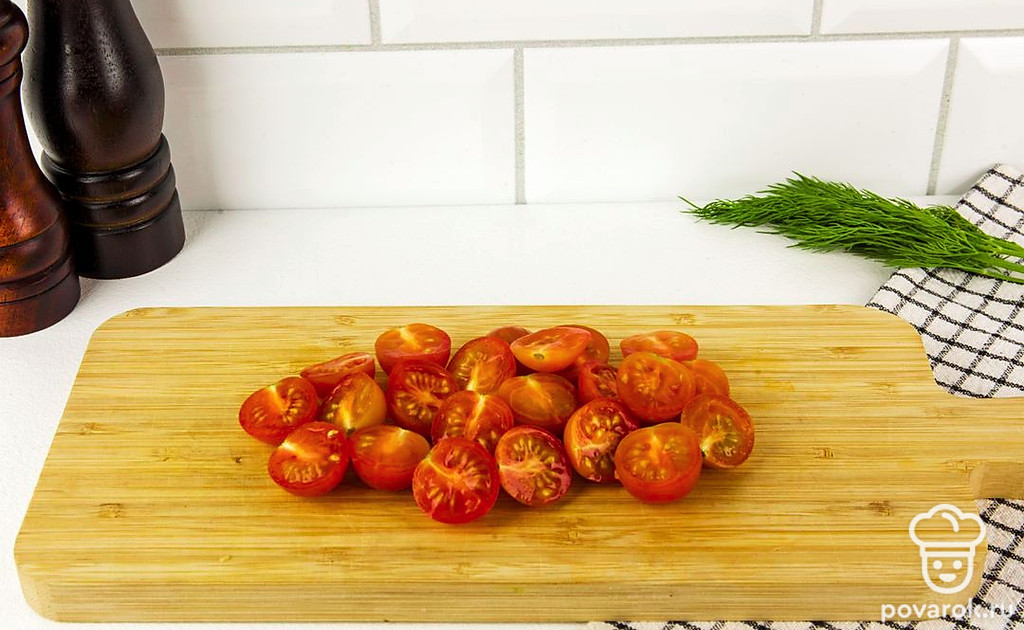 Подавайте перцы с тушеными помидорами черри и любимой зеленью.