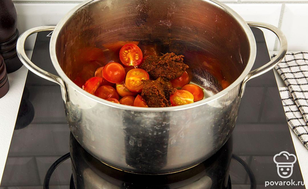 В кастрюлю с толстым дном добавьте масло, помидоры черри и аджику. Тушите 2-3 минуты.