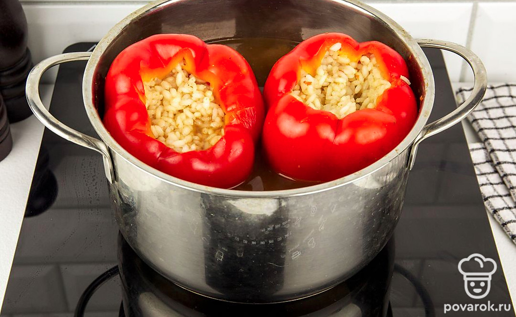 Добавьте в кастрюлю 2 литра воды и перцы. Тушите перцы 20-25 минут под крышкой на медленном огне.