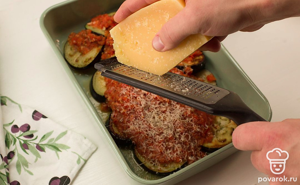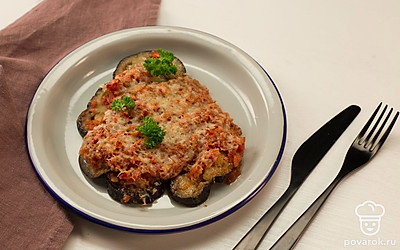 В форму для запекания вылейте получившуюся томатную пасту, выложите баклажаны и присыпьте сыром. Отправьте форму в разогретую духовку на 15 минут.