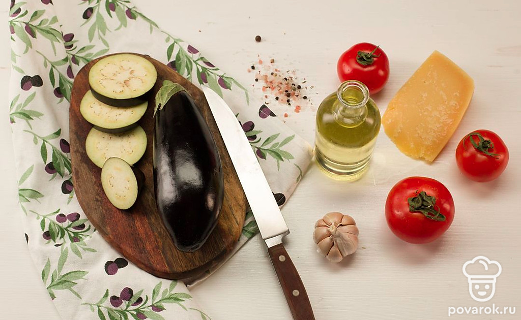 Баклажаны нарежьте кольцами и замочите на 20 минут в холодной воде с добавлением соли и сахара. Очистите чеснок, натрите пармезан на мелкой терке. Разогрейте духовку до 200°C. Подготовьте форму для запекания.