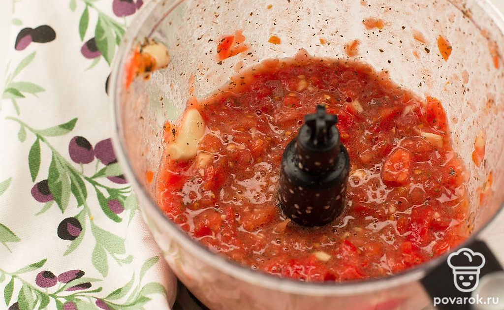 Помидоры слайсами с чесноком и орегано взбейте с помощью блендера до состояния пасты.