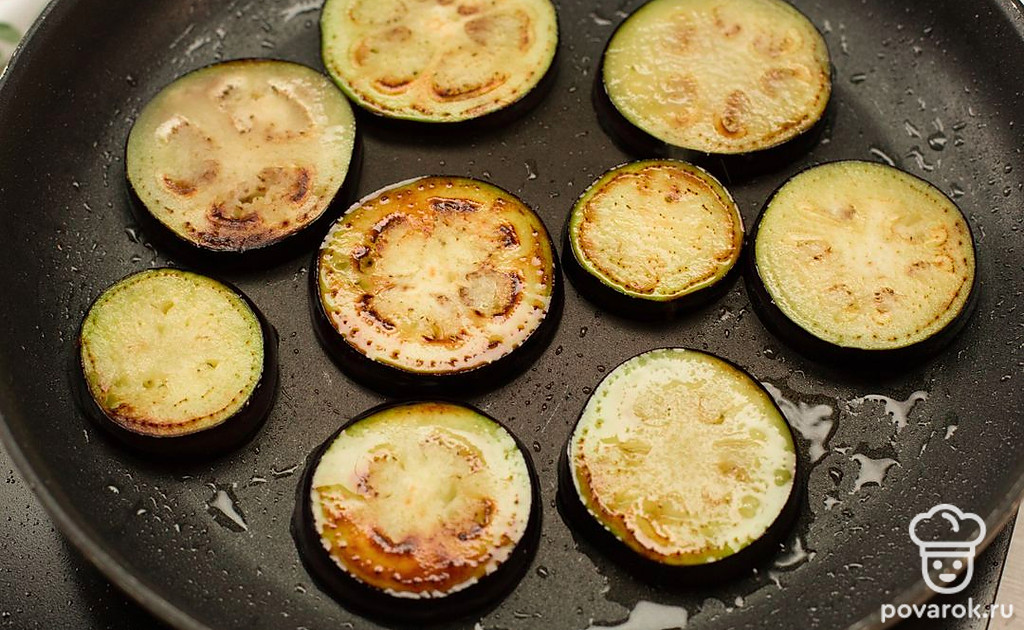 На сковороде с разогретым растительным маслом обжарьте подготовленные баклажаны до золотистого цвета.