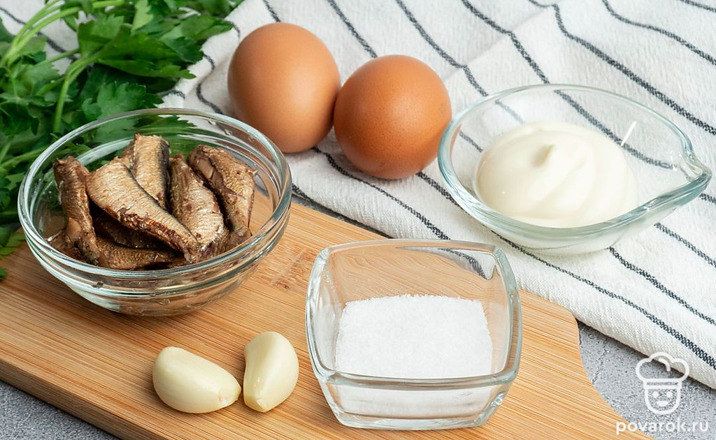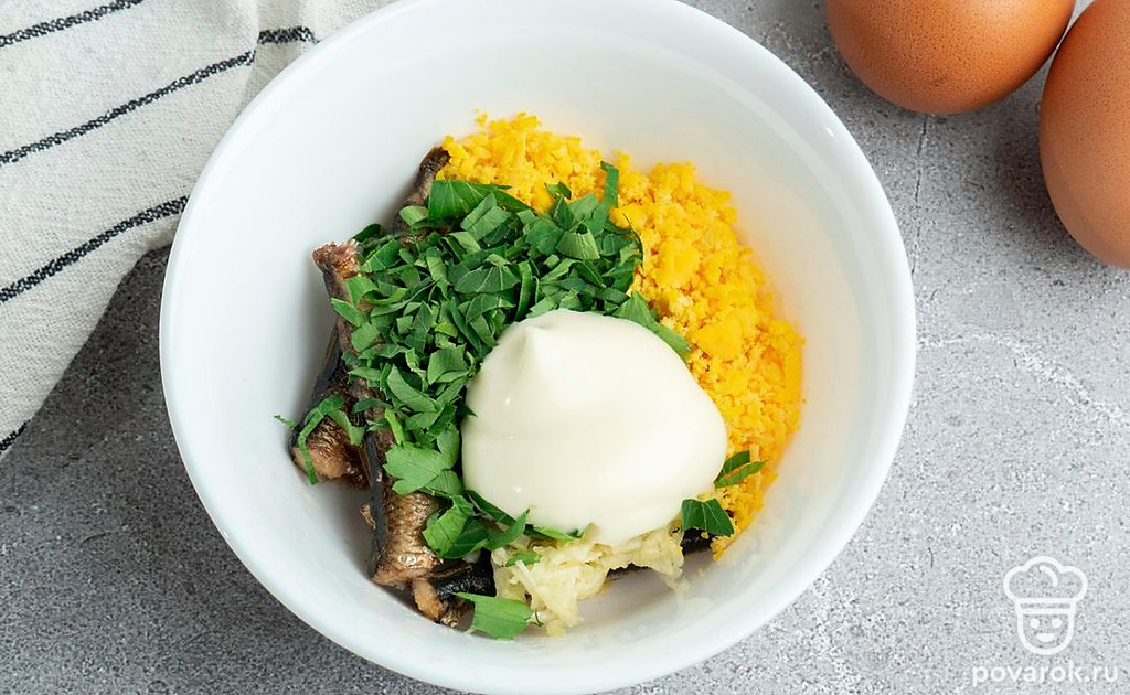 Измельчите чеснок, шпроты и петрушку. Добавьте к желткам шпроты, чеснок, петрушку и майонез. Хорошо перемешайте.