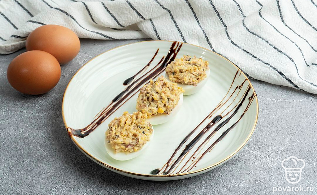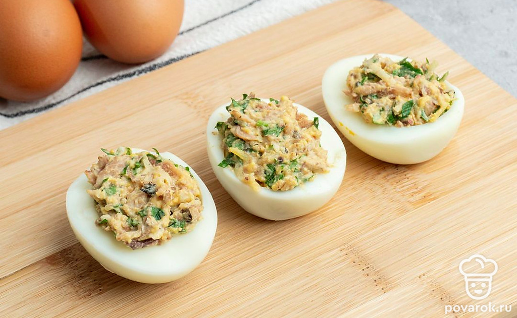 Отличная закуска на праздничный стол или на каждый день — яйца, фаршированные шпротами, петрушкой и чесноком. Это простое и быстрое в приготовлении блюдо, а с начинками можно каждый раз импровизировать.