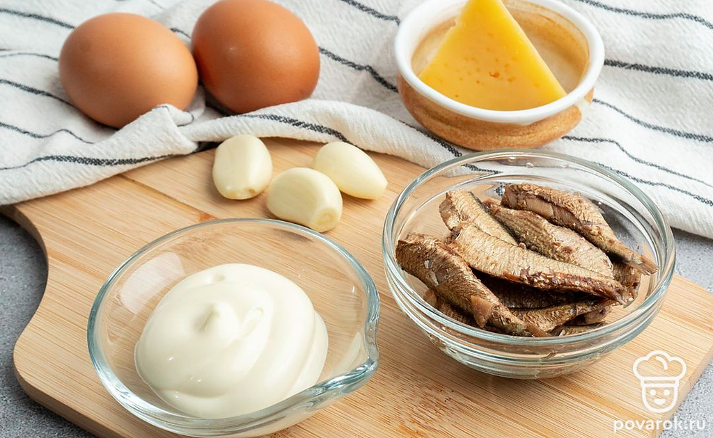 Отварите яйца в течение 10 минут и очистите от скорлупы. Разрежьте яйца пополам, выньте желток и положите его в отдельную посуду. Подготовьте 3 зубчика чеснока и шпроты.
