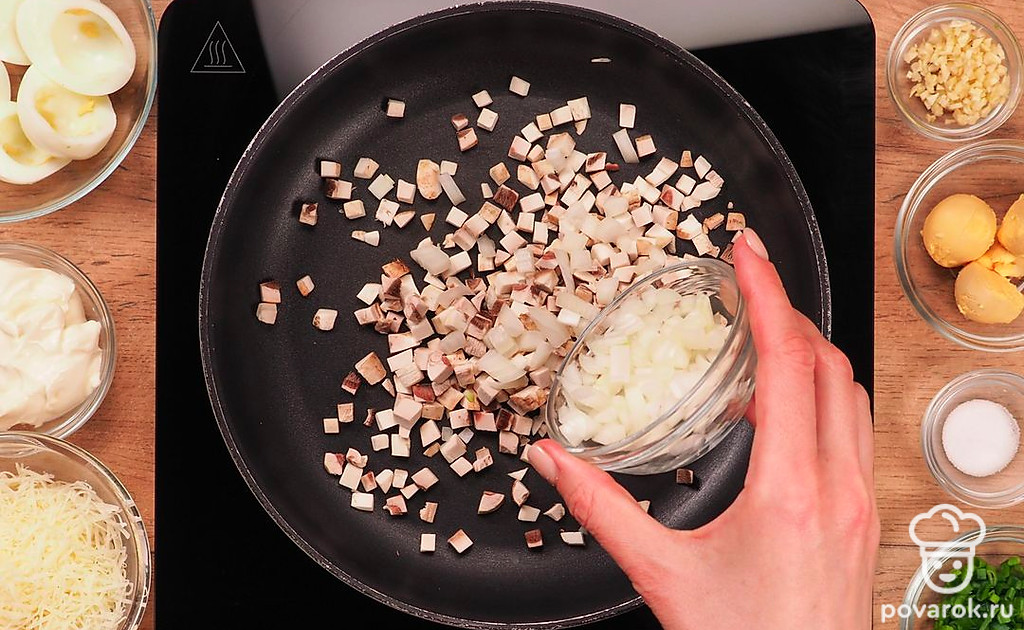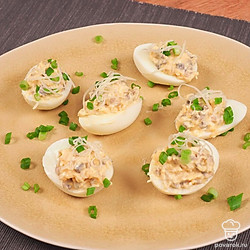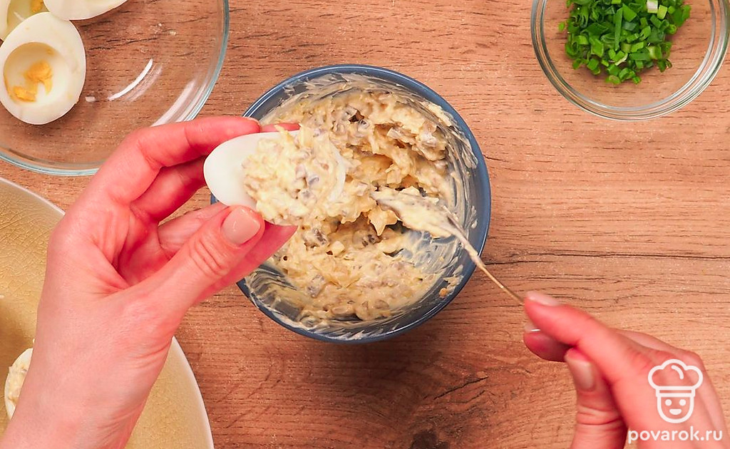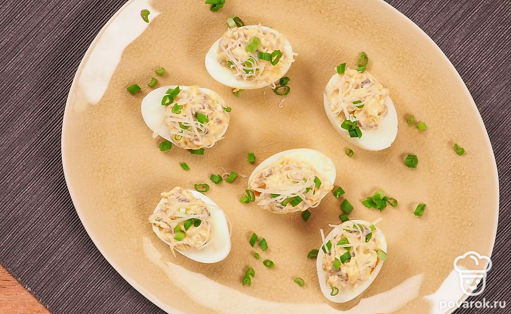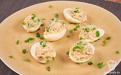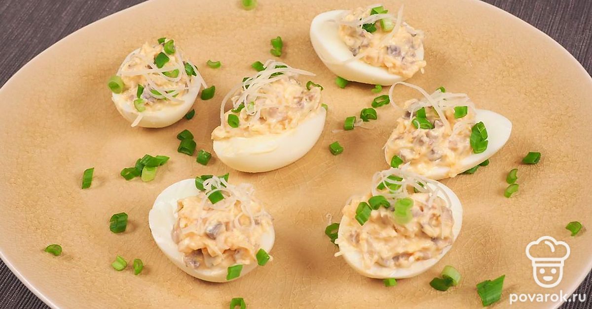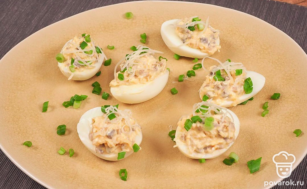 Фаршированные яйца — хорошая идея для холодной закуски к приходу гостей или для праздничного фуршета. Фаршировать блюдо можно по-разному. Вкусная и питательная начинка получается из обжаренных с луком шампиньонов и тертого сыра, смешанного с чесноком. Рецепт яиц фаршированных грибами элементарный, а закуска получается очень вкусной. Используйте в приготовлении свежие шампиньоны — их шляпка должна быть прочной и гладкой, а ножка — упругой.