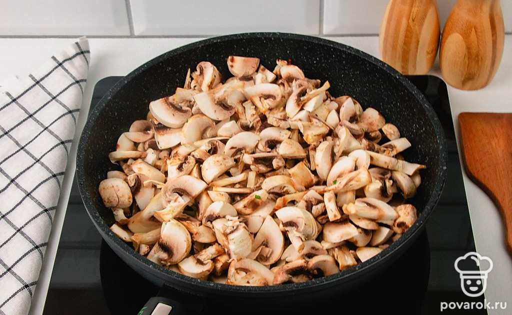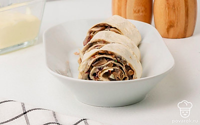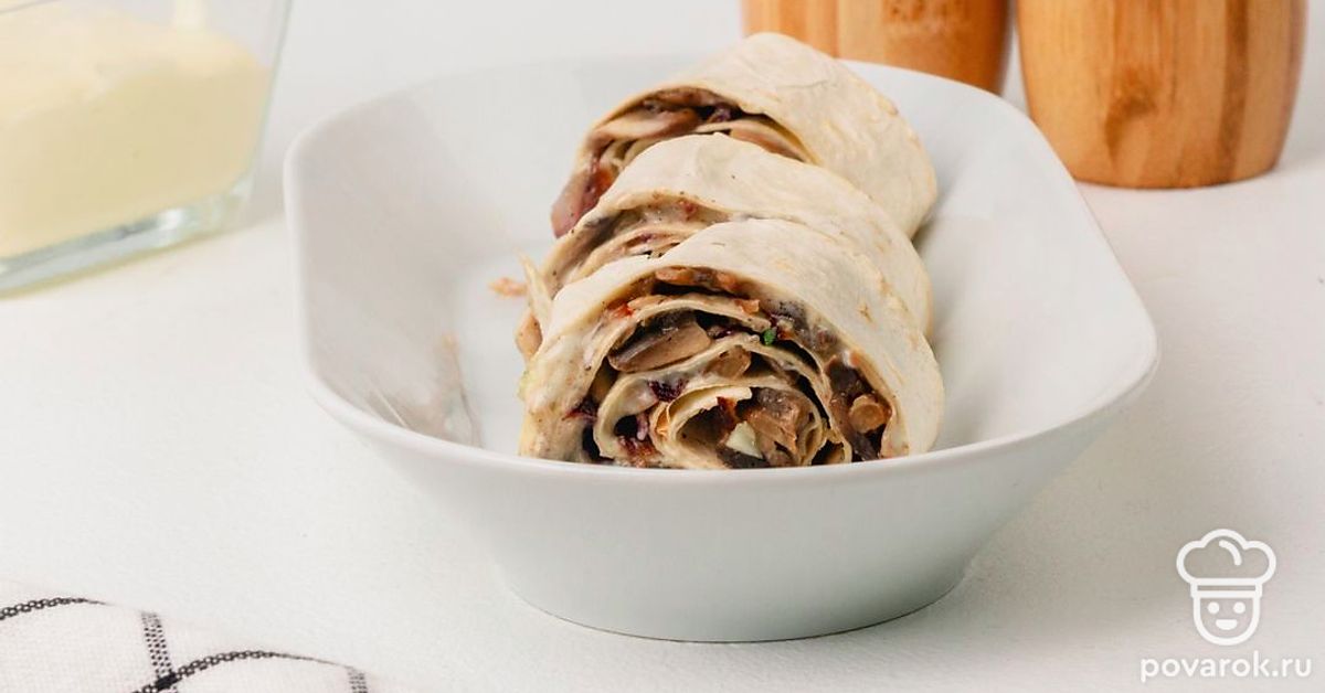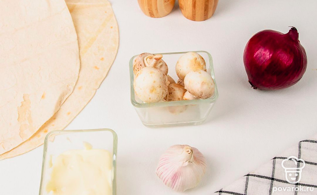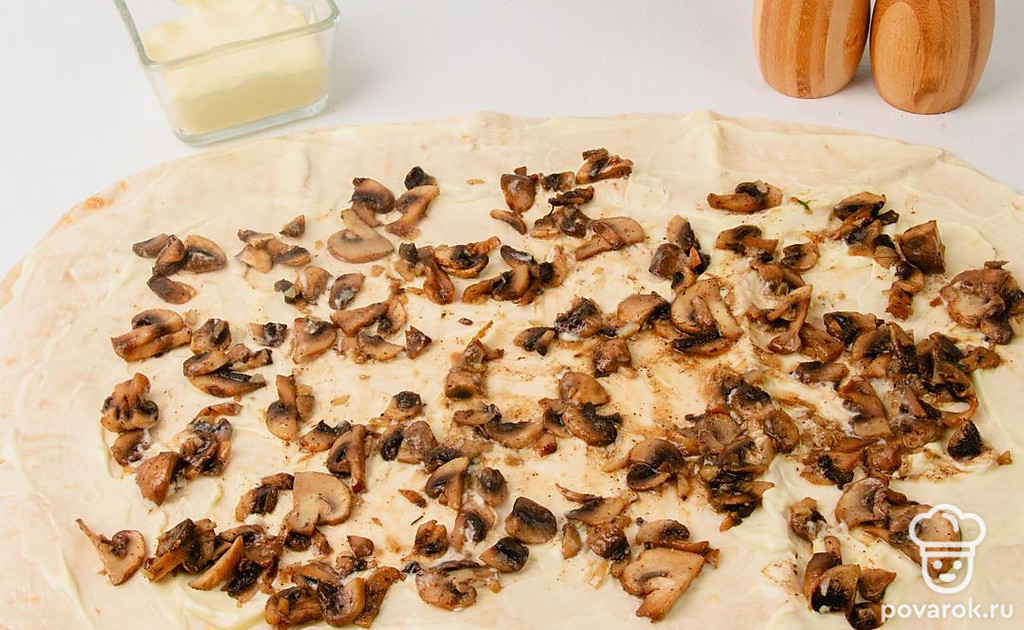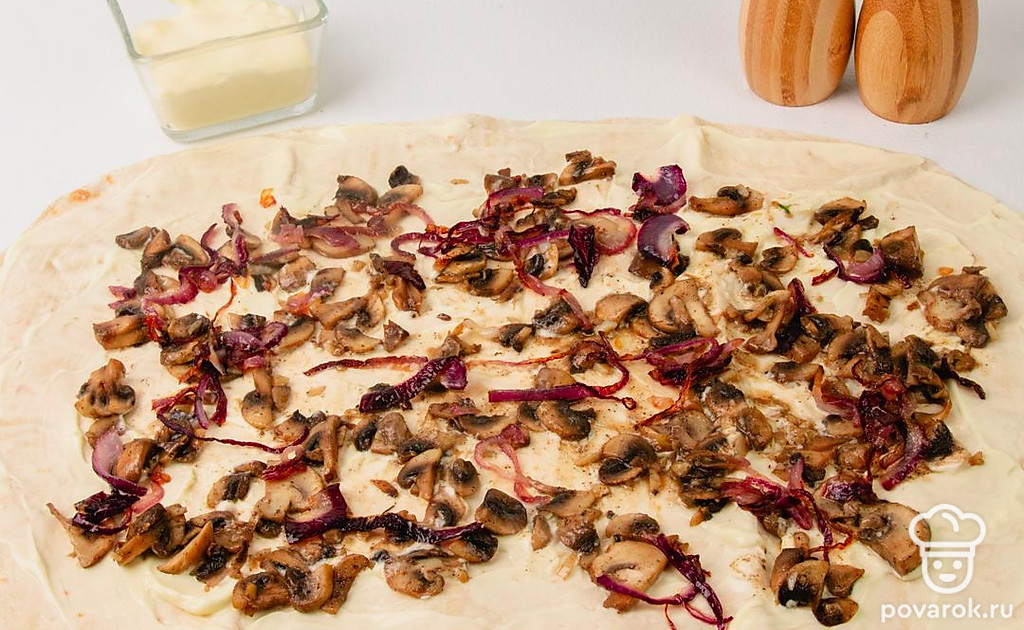 Равномерно распределите по смазанному сыром лавашу обжаренные грибы.