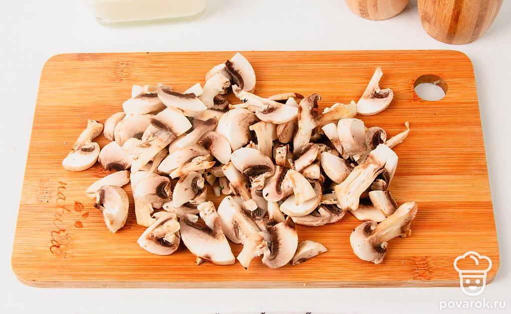 Очищенный лук нарежьте полукольцами, чеснок мелкими кубиками, а шампиньоны тонкими слайсами.