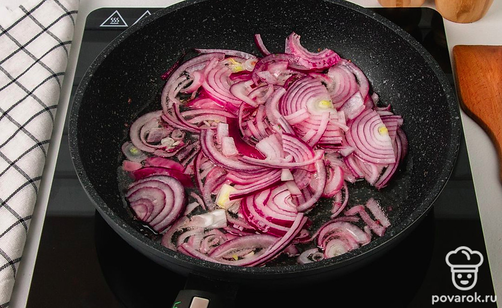 На разогретую сковороду выложите нарезанный лук, обжаривайте до готовности. Лук должен быть мягким и не должен хрустеть. Переложите обжаренный лук в чистую тару.