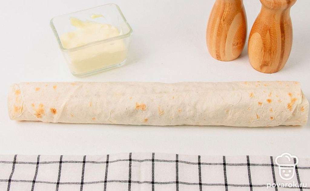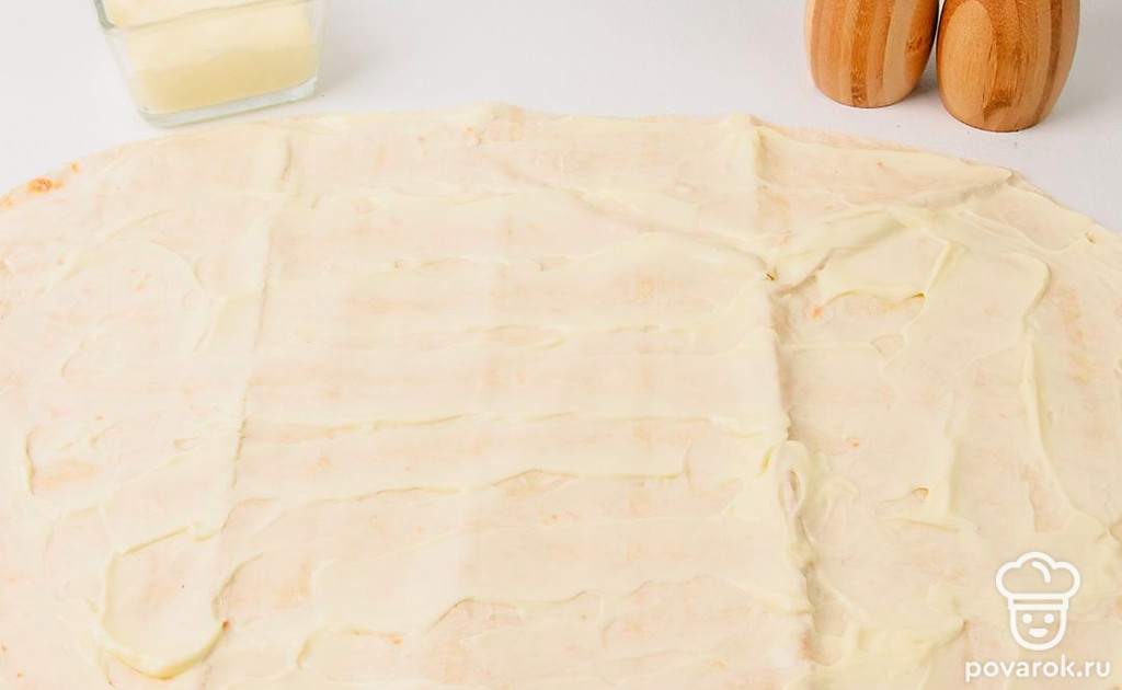Разложите лист лаваша, смажьте равномерным слоем сливочного сыра.