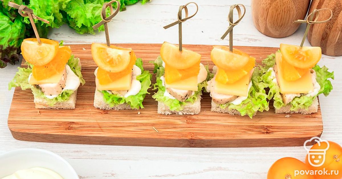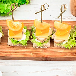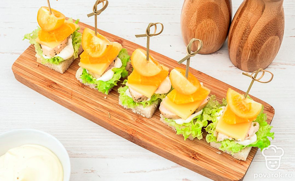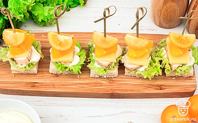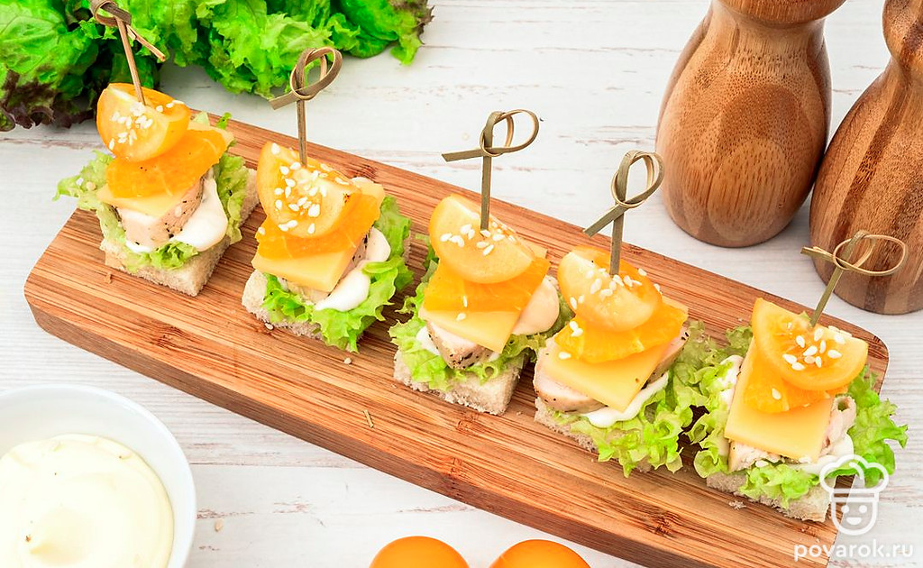 Канапе — это небольшая закуска из самых разных ингредиентов. Традиционно канапе подают на фуршетах или перед основным блюдом. В современной кухне искусство канапе переросло в отдельную область кулинарии, а число рецептов исчисляется тысячами. Главные плюсы этого блюда — простота в приготовлении и интересная подача. В этом варианте начинки используется оригинальное сочетание ингредиентов. Курица, апельсин, помидоры и сыр создают яркий и запоминающийся вкус.