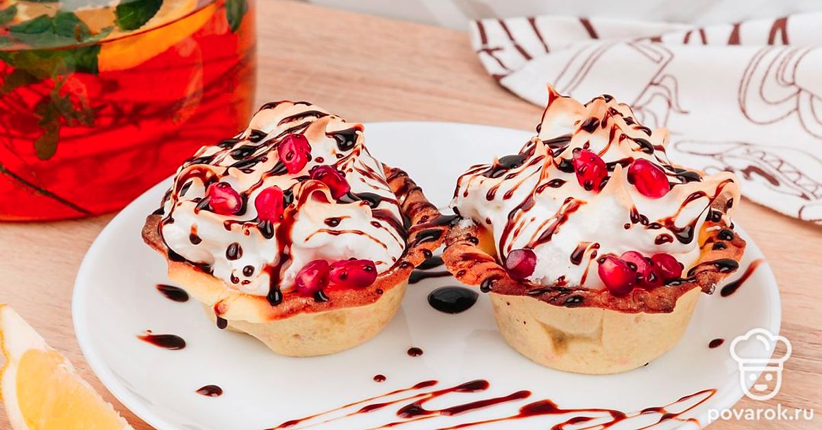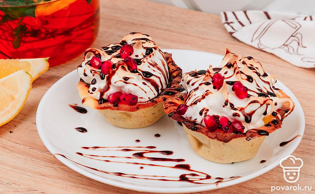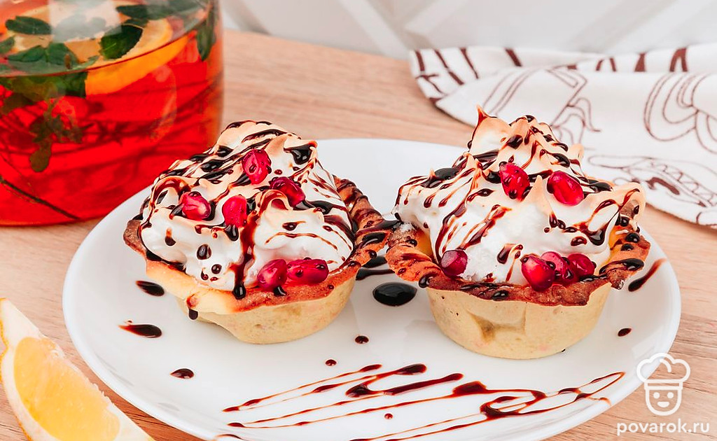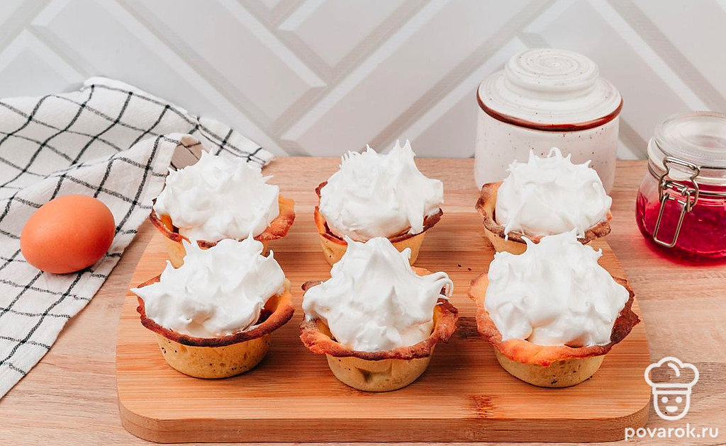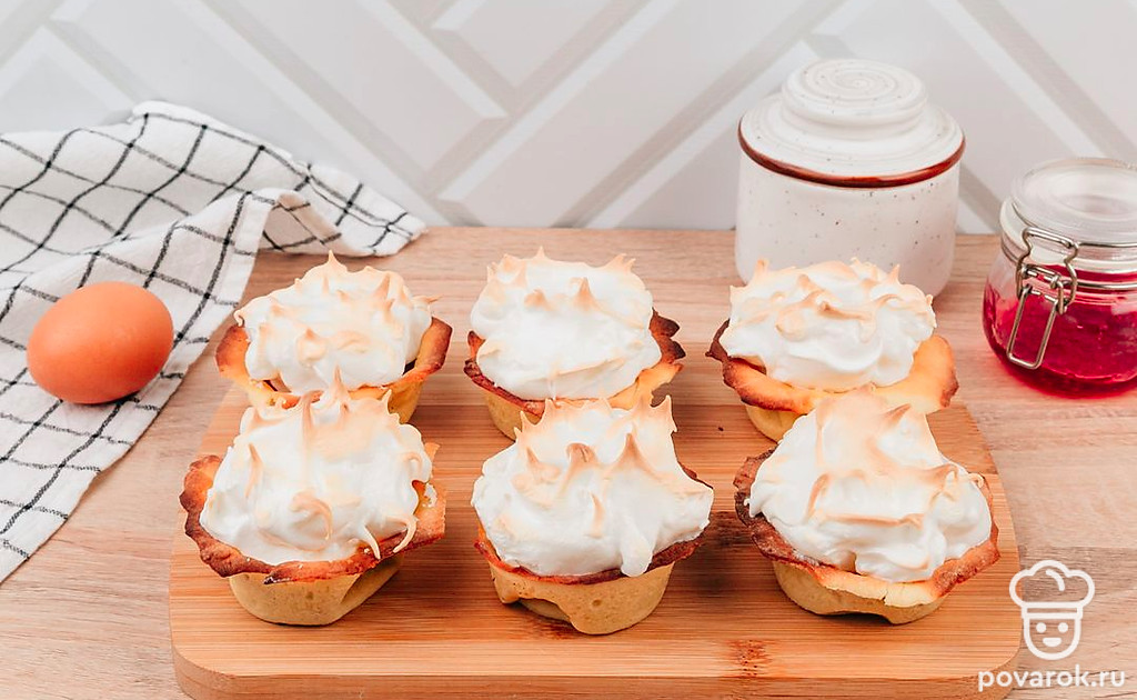 Меренга (или безе) — десерт, пришедший к нам из Европы. Впервые лакомство упоминается в 17 веке в кулинарной книге Франсуа Массиало. Изначально десерт подавался лишь к королевскому столу. Но из-за простоты приготовления и доступности ингредиентов меренги стали подаваться в кафе, ресторанах. Хозяйки стали готовить его дома. Меренги могут быть самостоятельным блюдом, но вкус малинового варенья и сочетание с песочной корзинкой дополнят его и сделают потрясающим десертом.