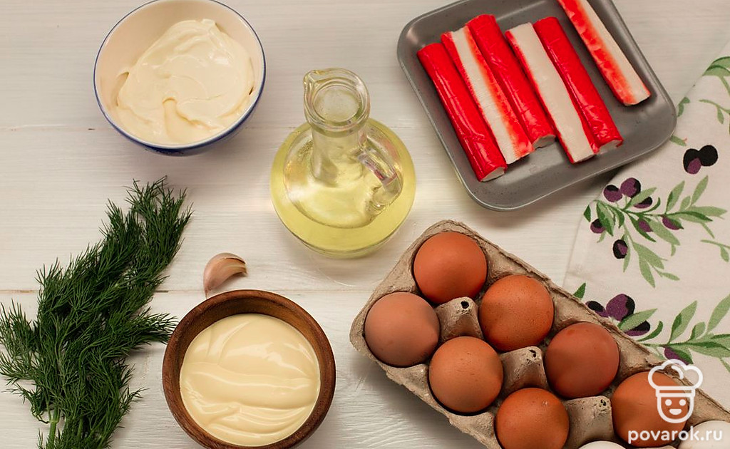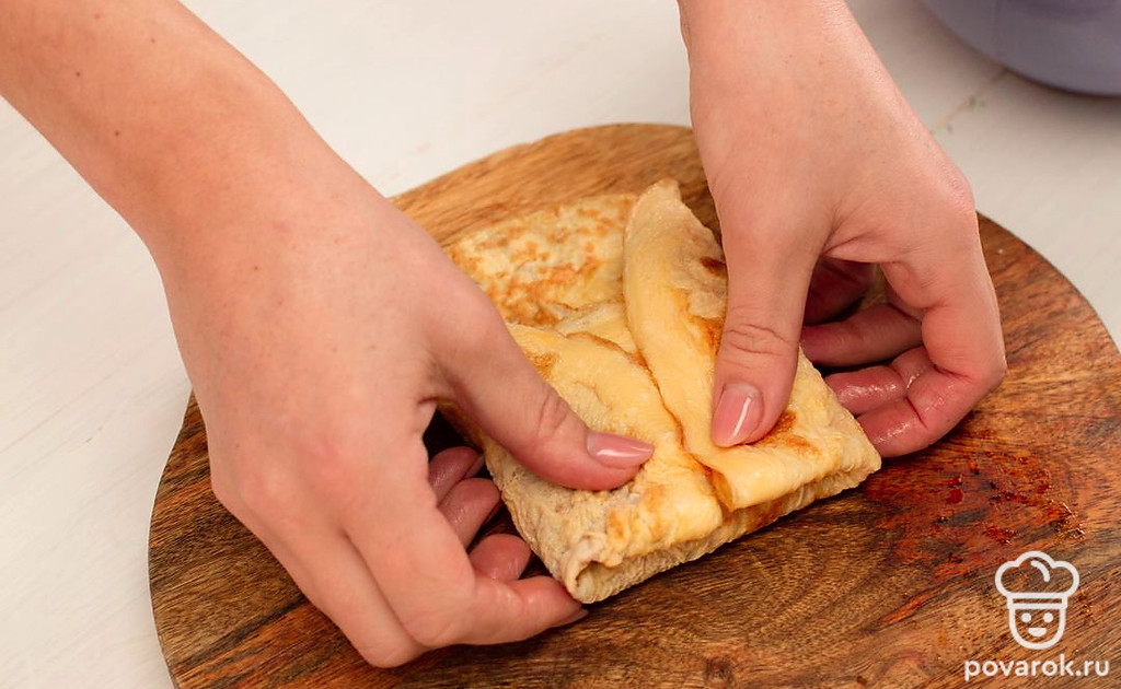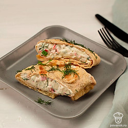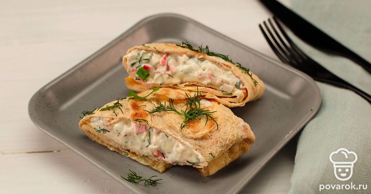 Яичные блинчики — отличная основа для массы блюд. Они могут быть самостоятельным блюдом, а вот если добавить к ним любимую начинку, то может получиться что-то действительно крутое! В качестве начинки у нас крабовые палочки, чеснок, сыр и майонез, но вы можете добавить в конвертики свежие овощи, зеленый лук или любимый соус. В итоге у вас получится полноценный завтрак или ужин.