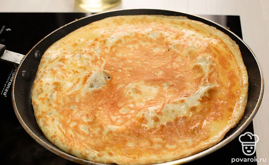 Хорошенько взбейте яйца и на сковороде с разогретым растительным маслом пожарьте яичные блинчики.