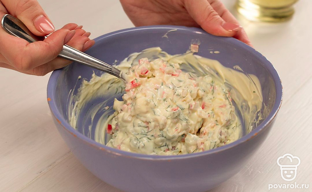 Соедините в миске крабовые палочки, чеснок, сыр, укроп, майонез и перемешайте.