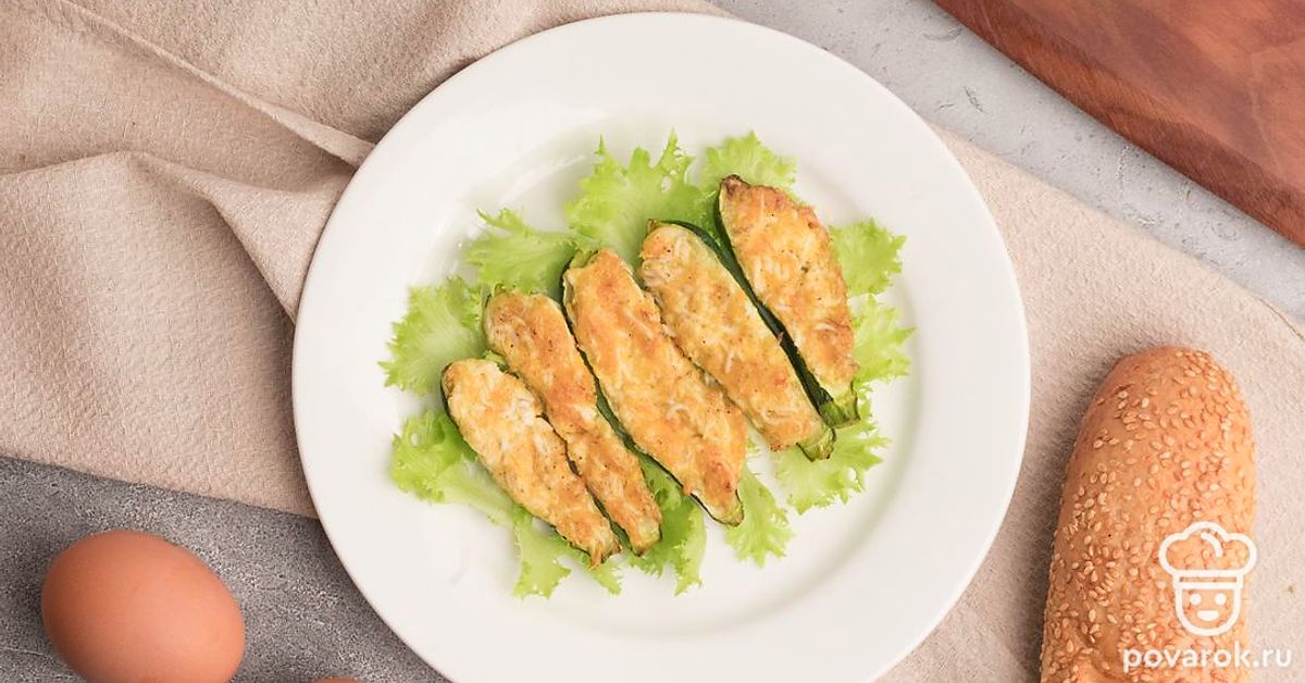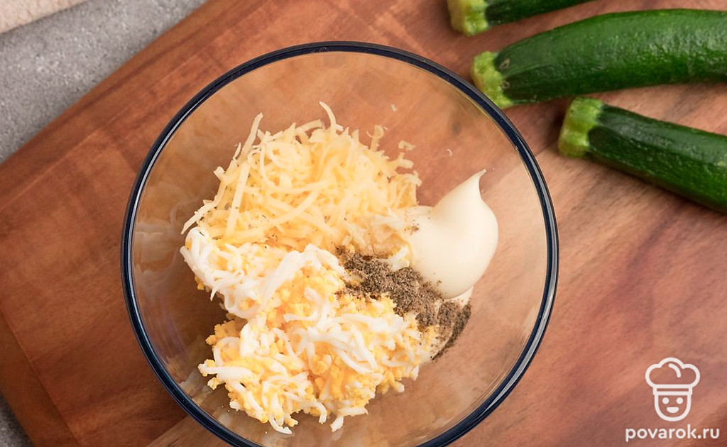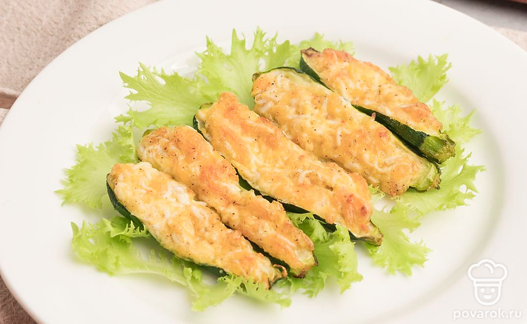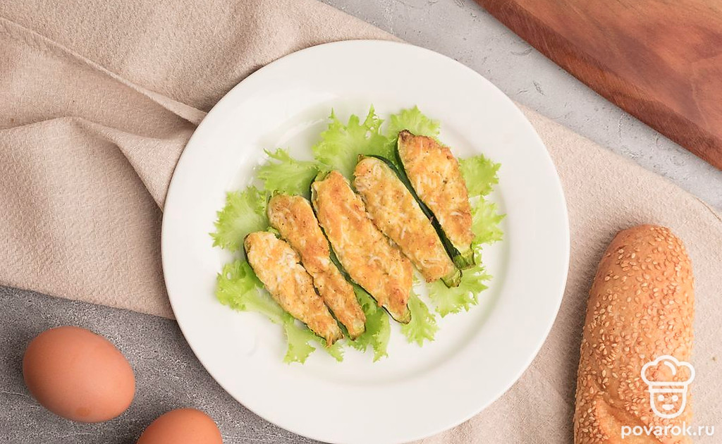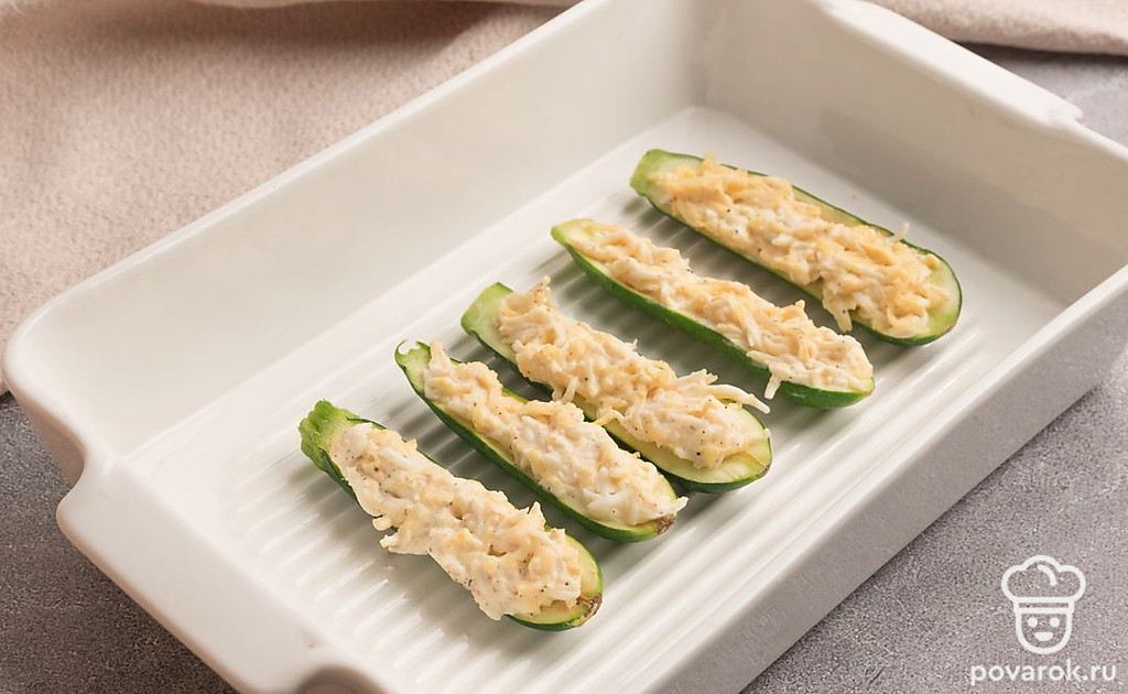 Кабачки разрежьте пополам, выньте столовой ложкой середину и нафаршируйте полученной начинкой. Выложите цуккини в форму для запекания и готовьте их в разогретой до 180 градусов духовке в течение 15-20 минут.