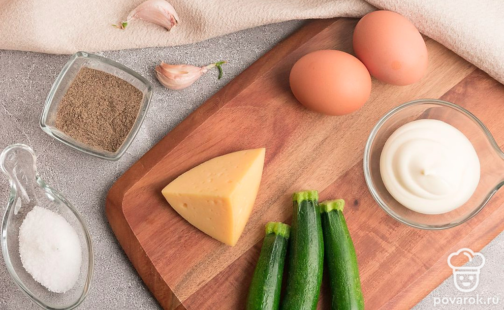 Выложите все ингредиенты на стол для удобства приготовления. Кабачки помойте, яйца отварите и почистите. Очистите чеснок.