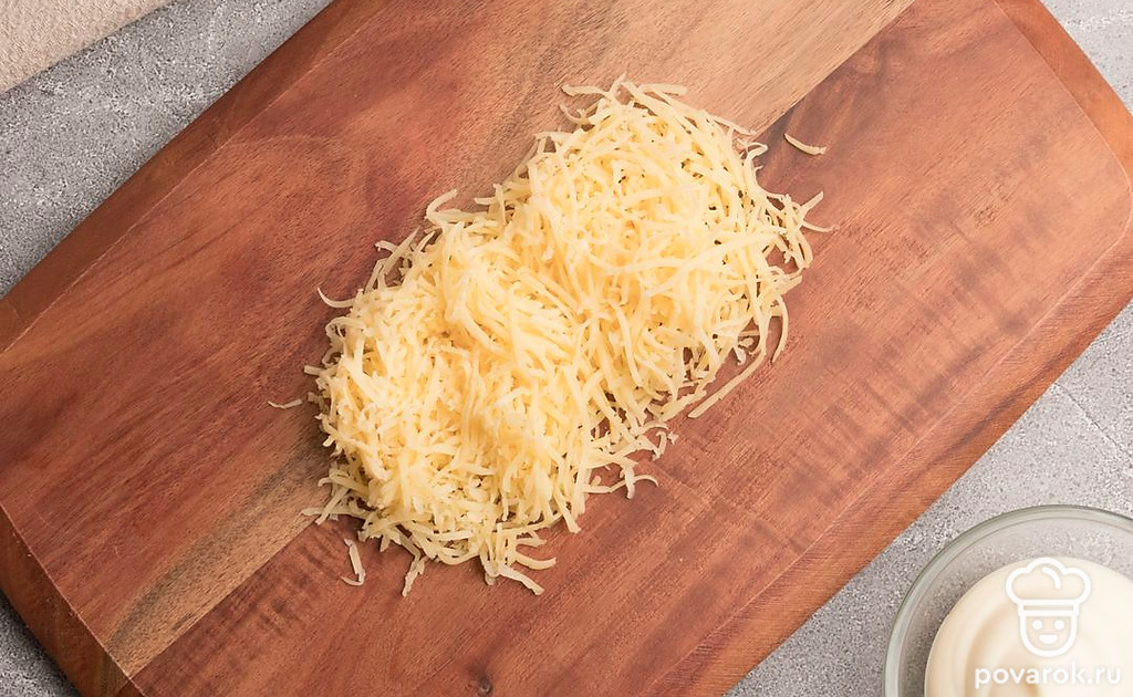 В глубокой тарелке смешайте сыр, яйца, майонез и чеснок, пропущенный через пресс. Посолите и поперчите по вкусу.