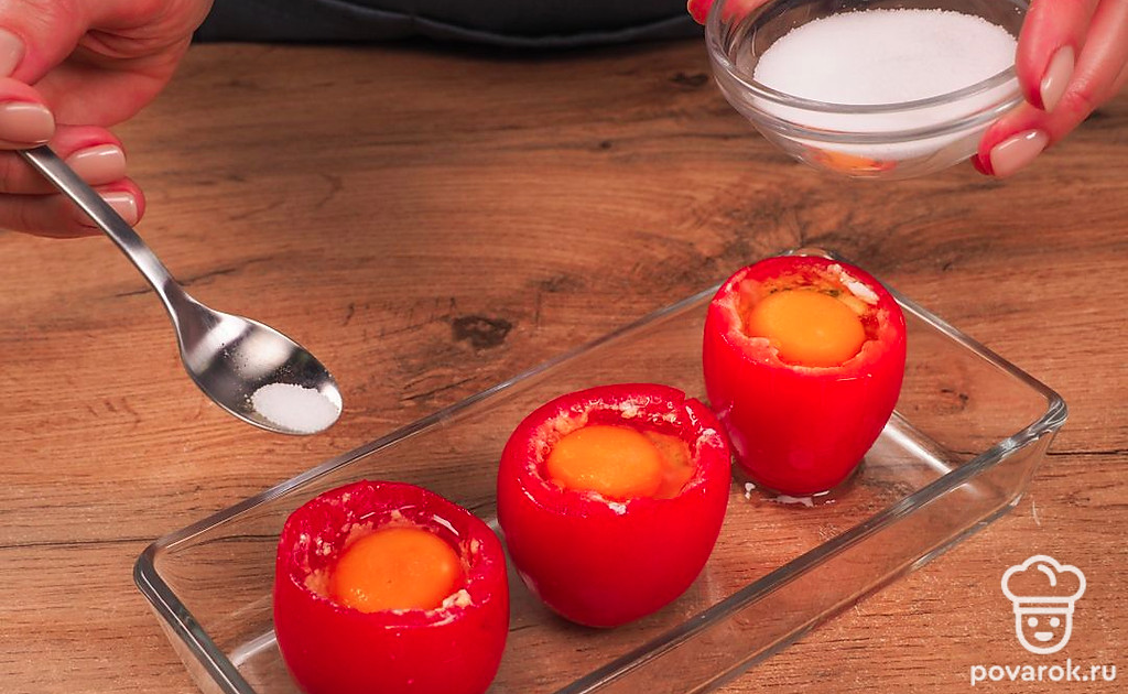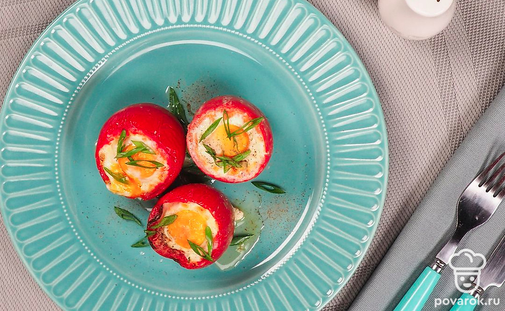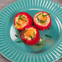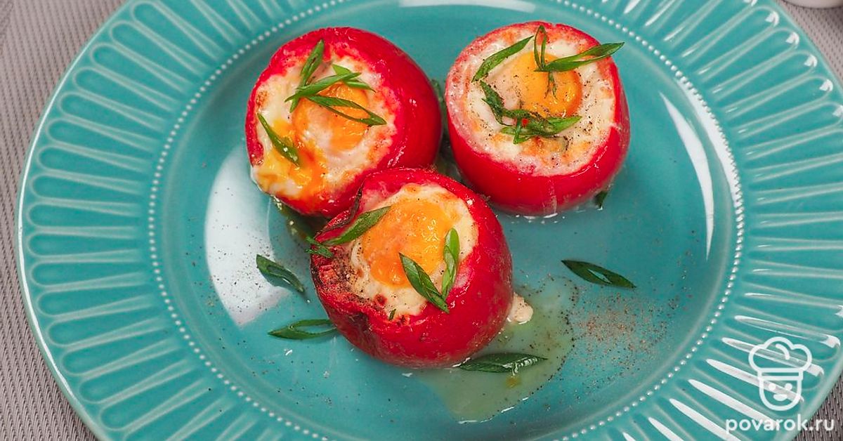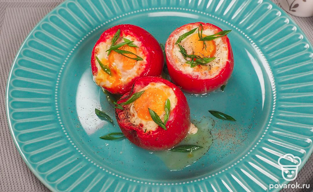 Помидоры, фаршированные яйцом, и запеченные в духовке получаются сочными и питательными. Особенностью в рецепте является топпинг из сырого яйца, которое запекается. При приготовлении горячей закуски используется брынза. Важно, чтобы она не была сильно соленой. Это может испортить вкус блюда. Вместо брынзы можно взять кисломолочный сыр, желательно домашний, с высоким процентом жирности. Помидоры берите среднего размера.