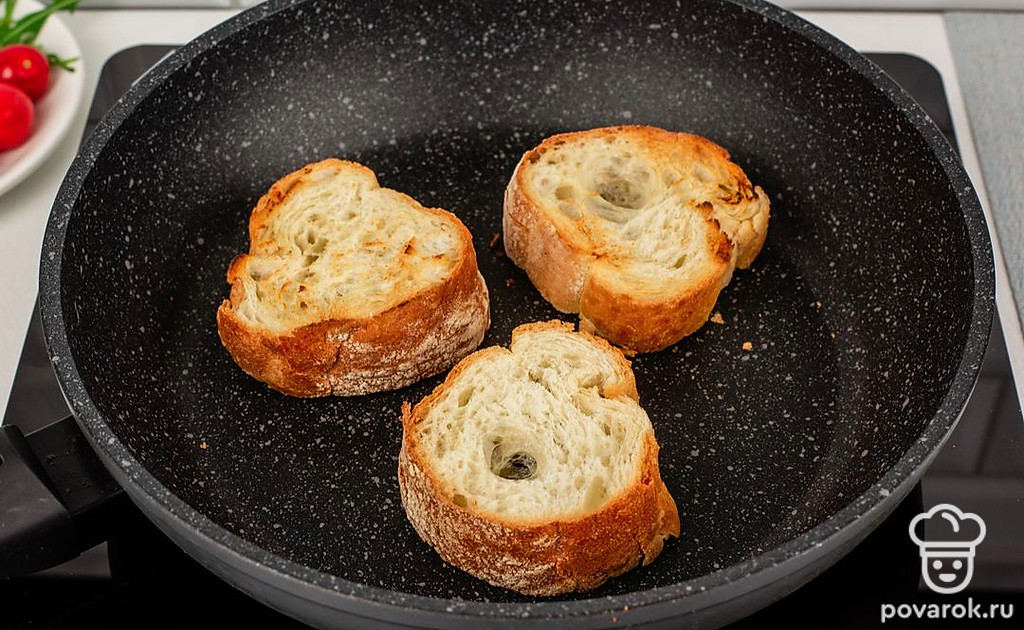 Разогрейте сухую сковороду и подсушите на ней ломтики багета по 2 минуты с каждой стороны.