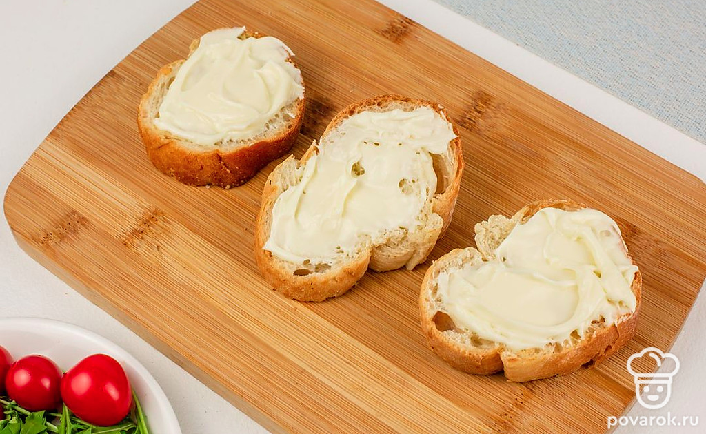 Багет смажьте плавленным сыром.