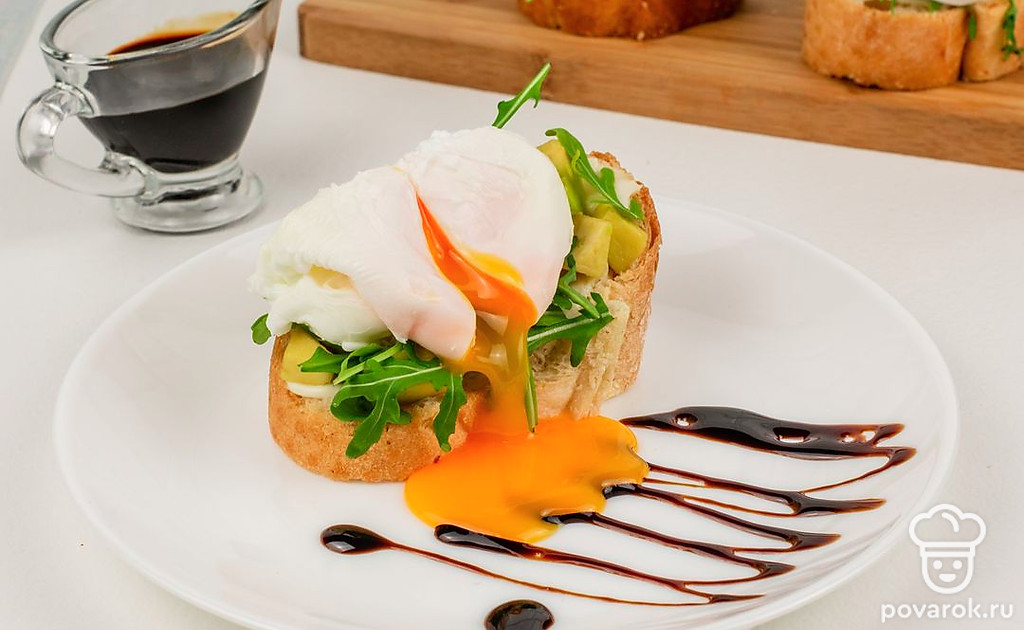 Готовые брускетты выложите на тарелку и сбрызните крем-бальзамиком. Надрежьте яйцо пашот, чтобы жидкий желток придал блюду эффектности.