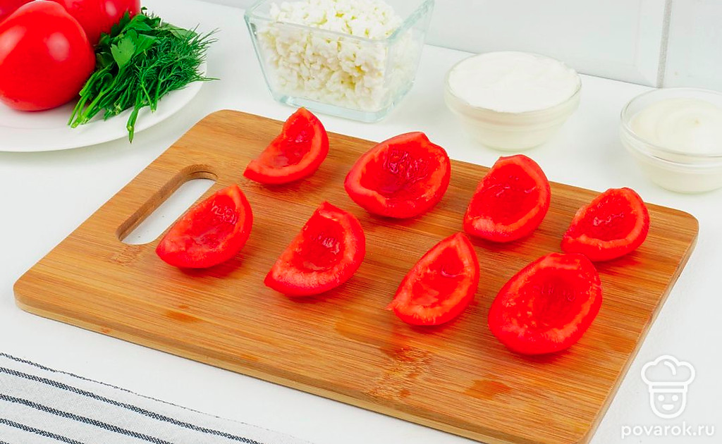 Подготовьте основу для закуски. Помидоры разрежьте на 4 части и аккуратно удалите из долек мякоть чайной ложкой.