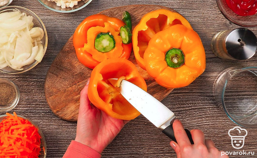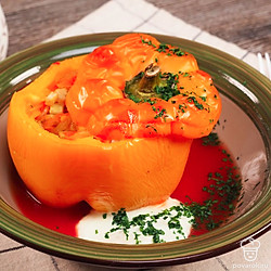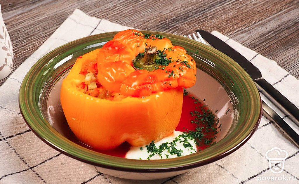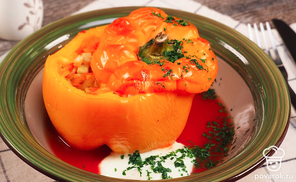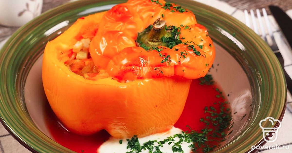 Перец фаршированный овощами — прекрасный гарнир для мясных блюд и самостоятельная овощная закуска. Это легкое и сытное блюдо готовится в духовке. Готовый перец нужно подать к столу горячим вместе со сметанным соусом и свежей зеленью. Перец фаршированный овощами — это постный рецепт, традиционно блюдо готовится с мясом.