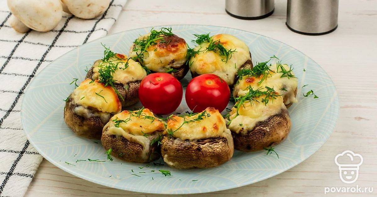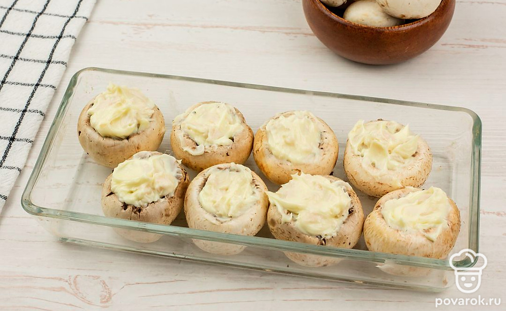 Положите начинку в шляпки грибов и поместите их в форму для выпечки.